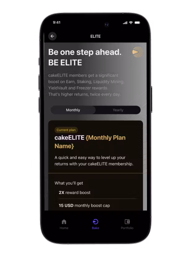 ELITE is an exclusive membership plan intended for serious crypto investors. It gives access to unparalleled benefits and returns unavailable to regular Bake users.