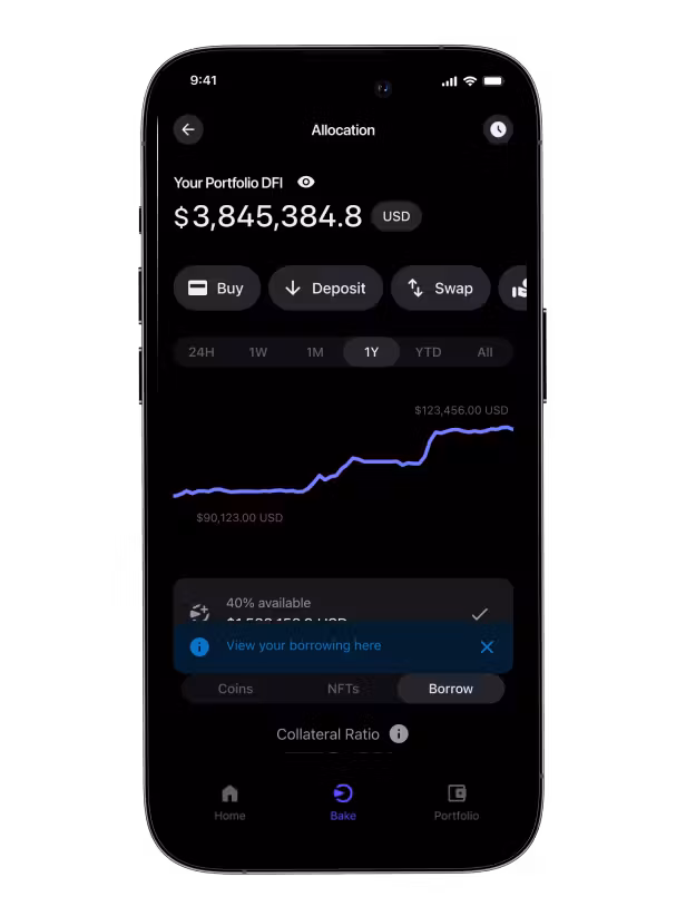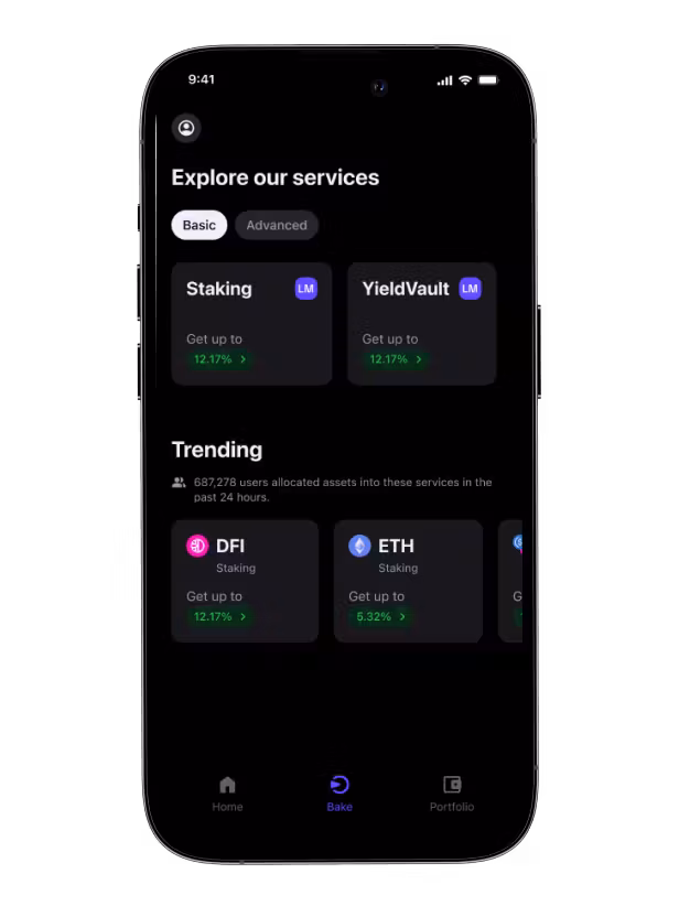 Bake is an all-in-one crypto application. It is designed so that anyone, whether a novice or advanced user, can easily benefit from investing in cryptocurrency. It achieves this through its intuitive UI, simple-to-understand products, and a familiar onboarding process.