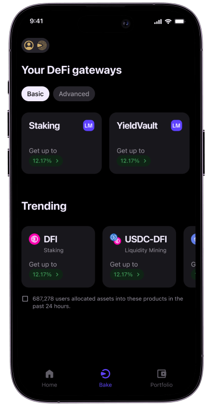 Ready to start generating profits from your crypto? You can easily access all the available services on the "Bake" page. We've also categorized them based on user experience level (basic and advanced) and provided details like Annual Percentage Yields (APYs) to help you make informed decisions.