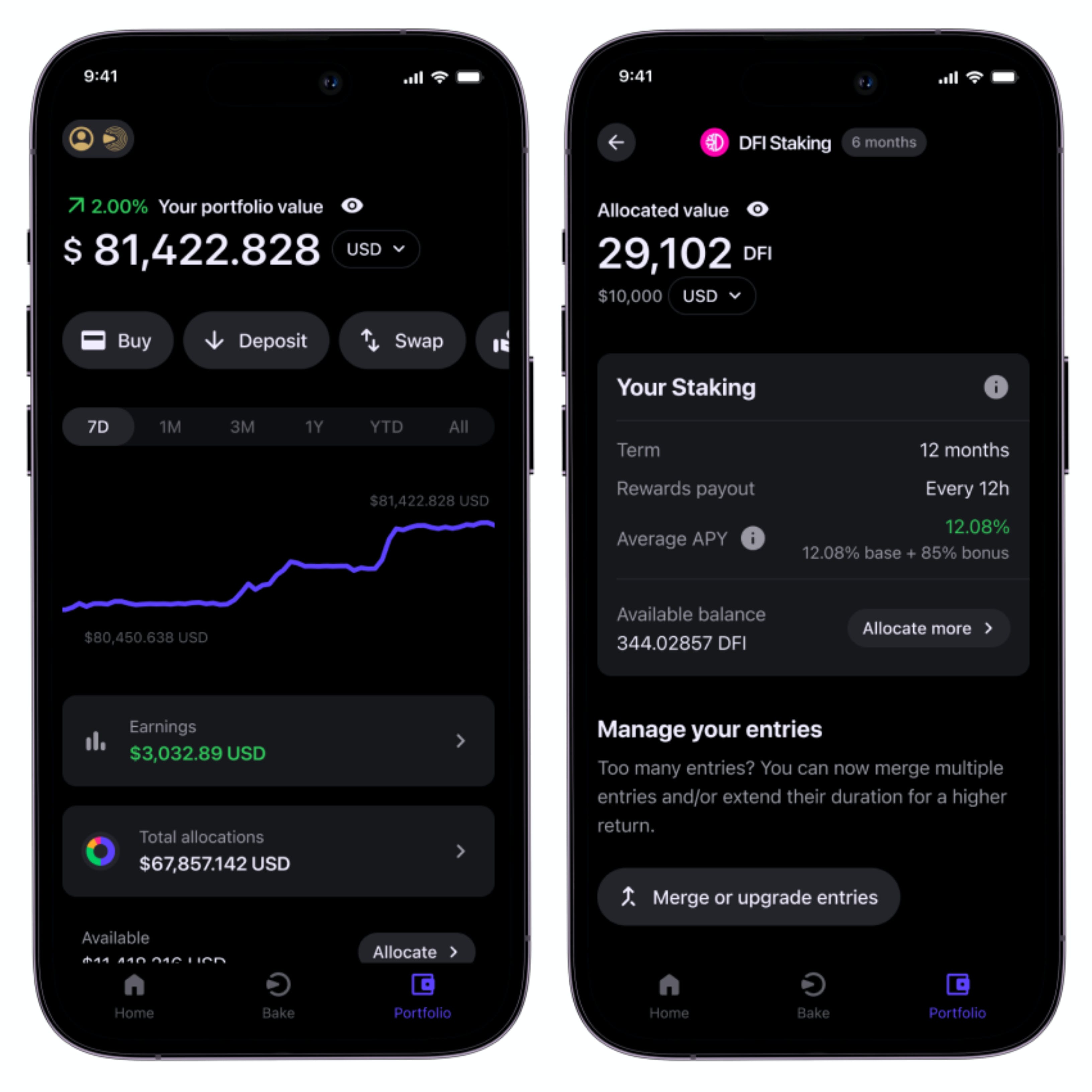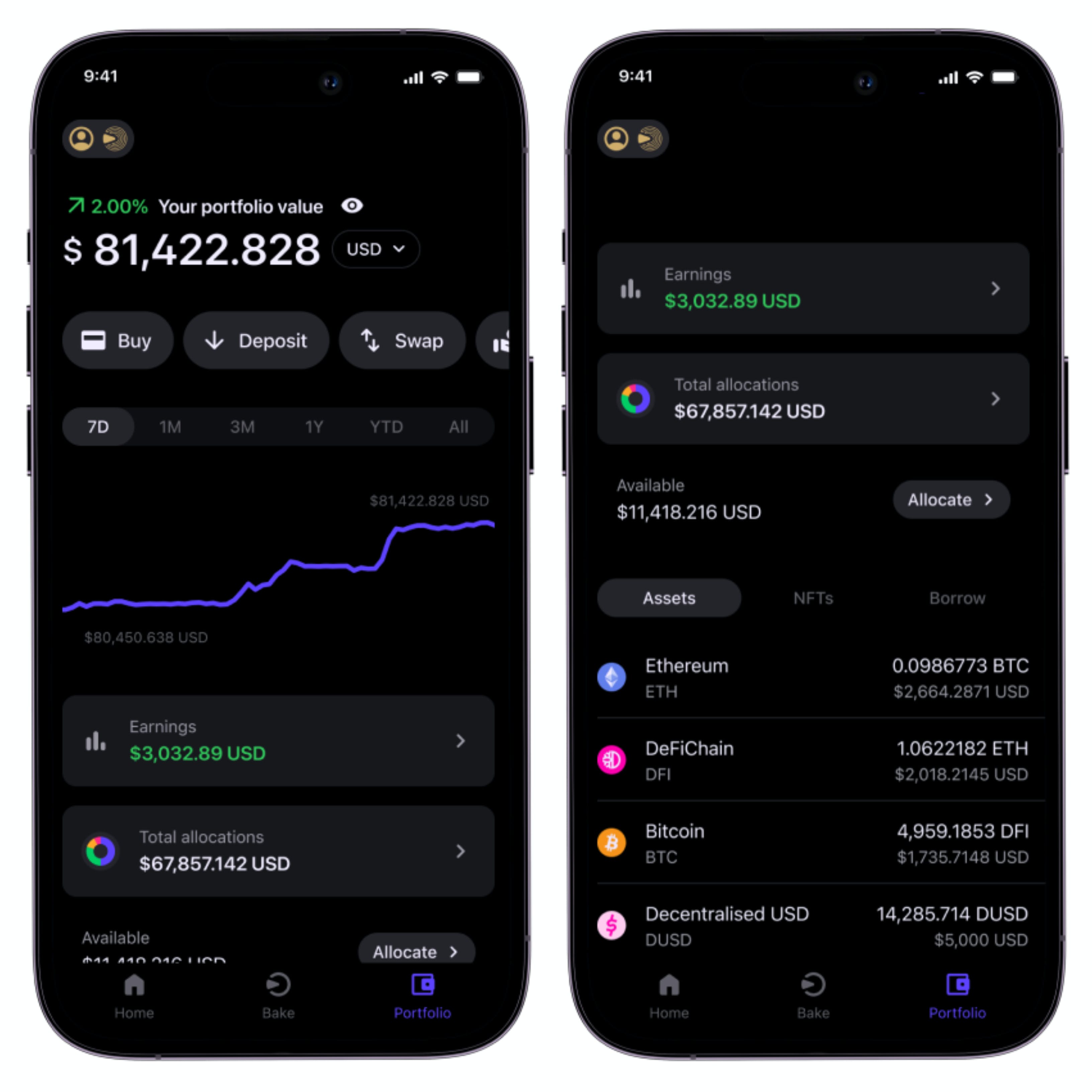 Struggling to manage your crypto portfolio? No worries - the Bake mobile app has all the necessary tools to help you grow and manage your portfolio. On the "Portfolio" page, you can: