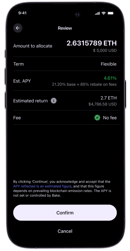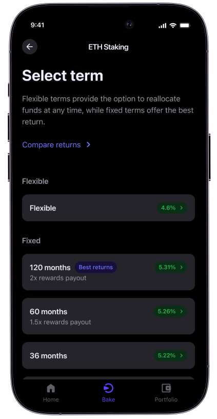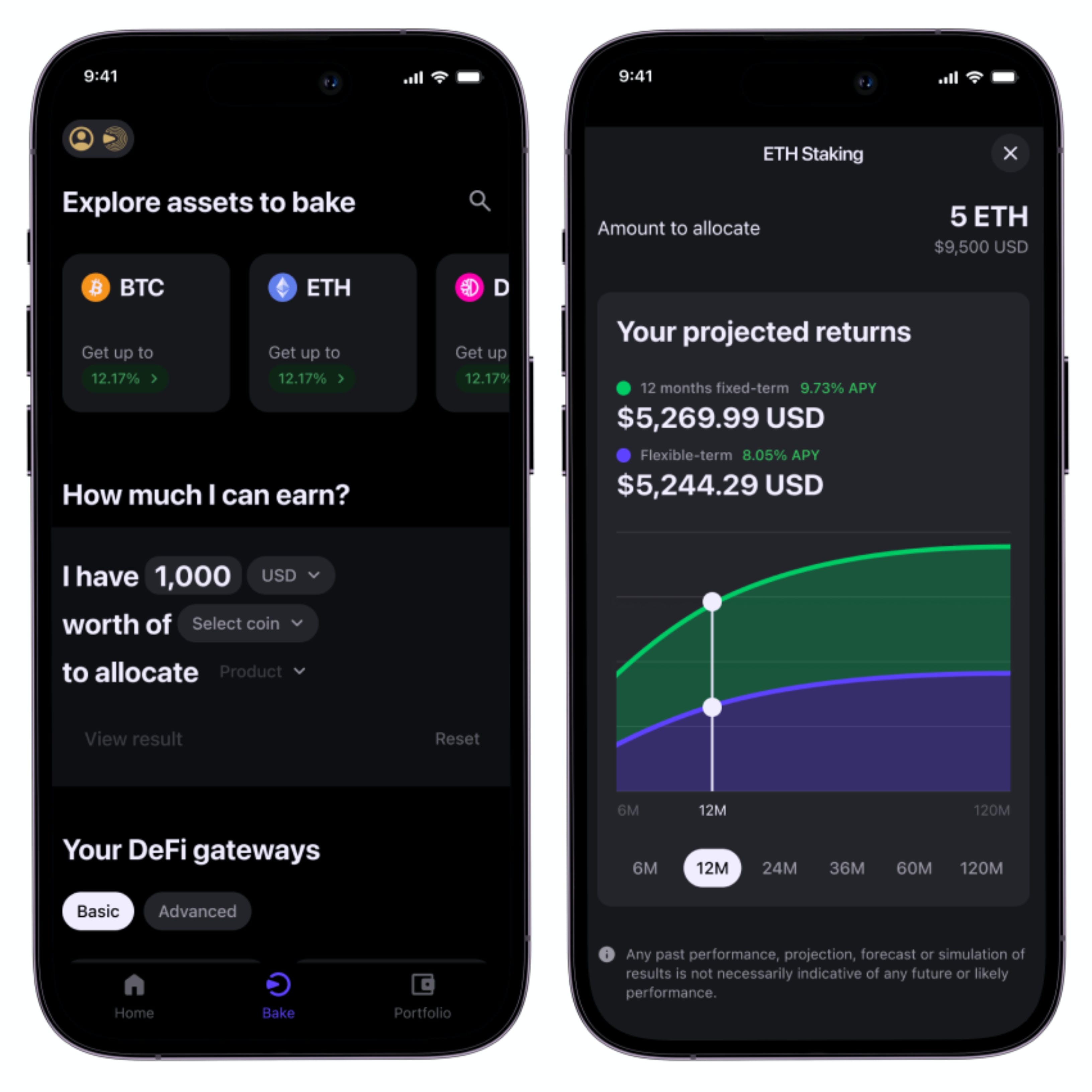 Not sure about the returns you might earn from your crypto assets? Our built-in calculator on the "Bake" page can help you estimate your potential earnings based on hypothetical scenarios. This tool assists you in choosing the best crypto to invest in, the ideal service for your needs and the expected returns over specific periods.