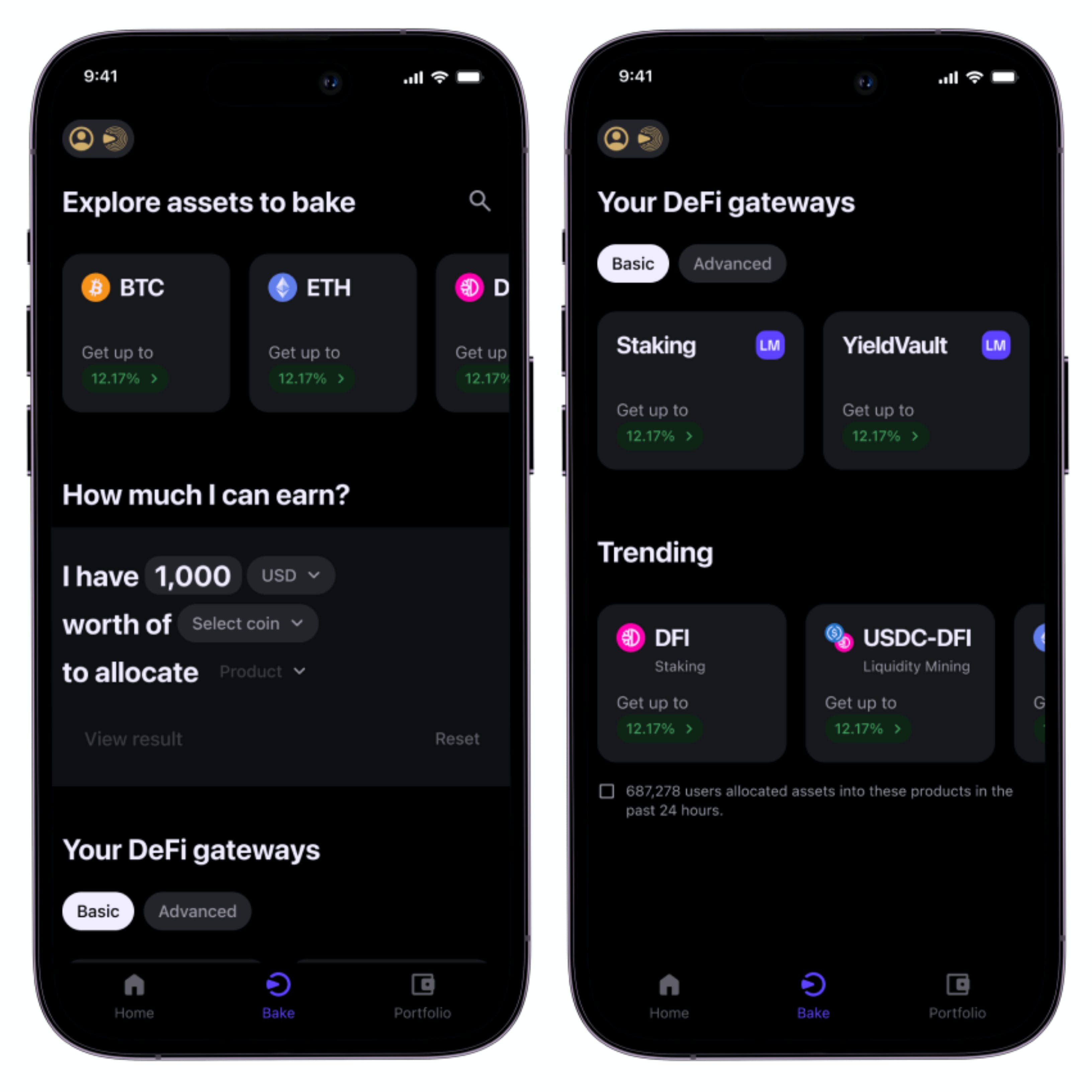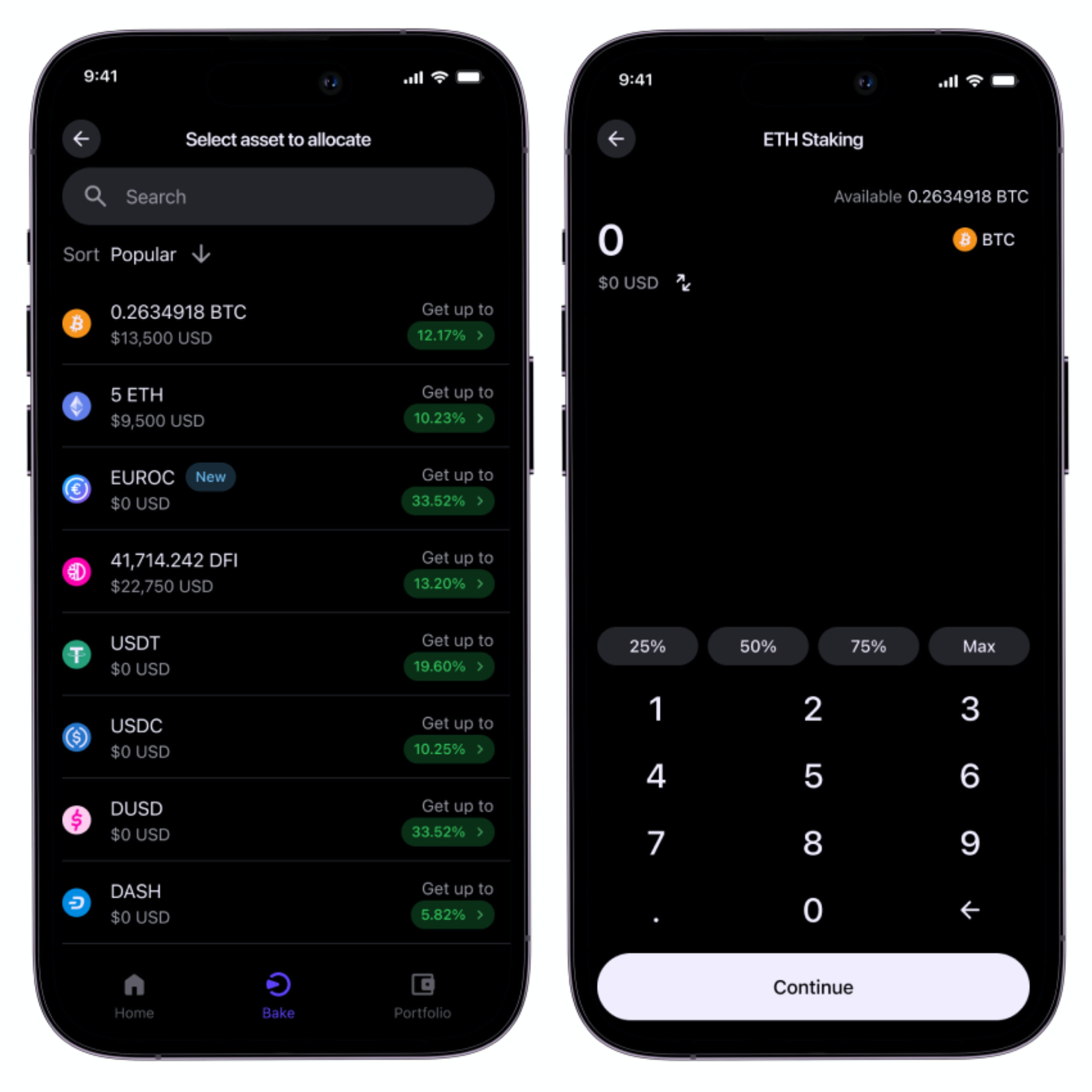 With the Bake mobile app, idle funds are a thing of the past. This section identifies which cryptocurrencies are unutilized, allowing you to put them to work instantly by clicking “Allocate”.