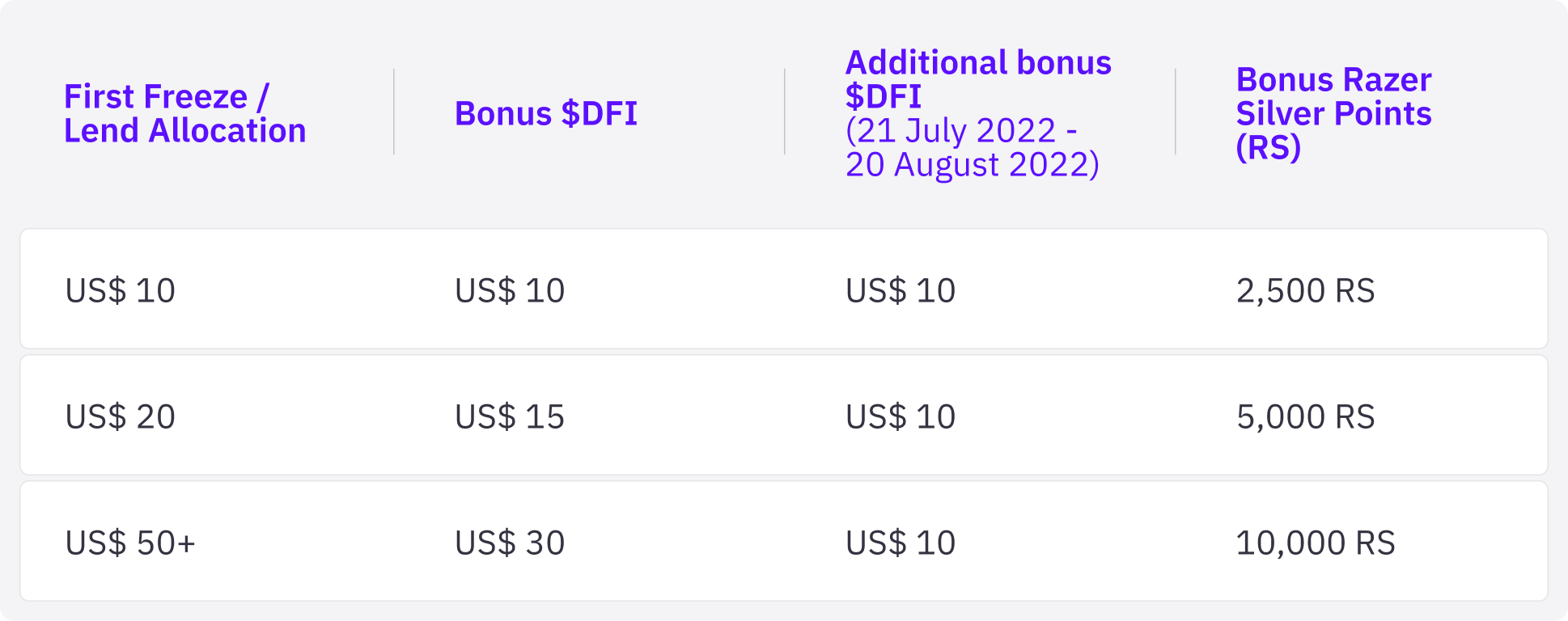 But the best thing is that during the promotion period from 21 July 2022 until 20 August 2022, 23:59 UTC, we are topping up the $DFI Bonus by a further US$10, for all three tiers.