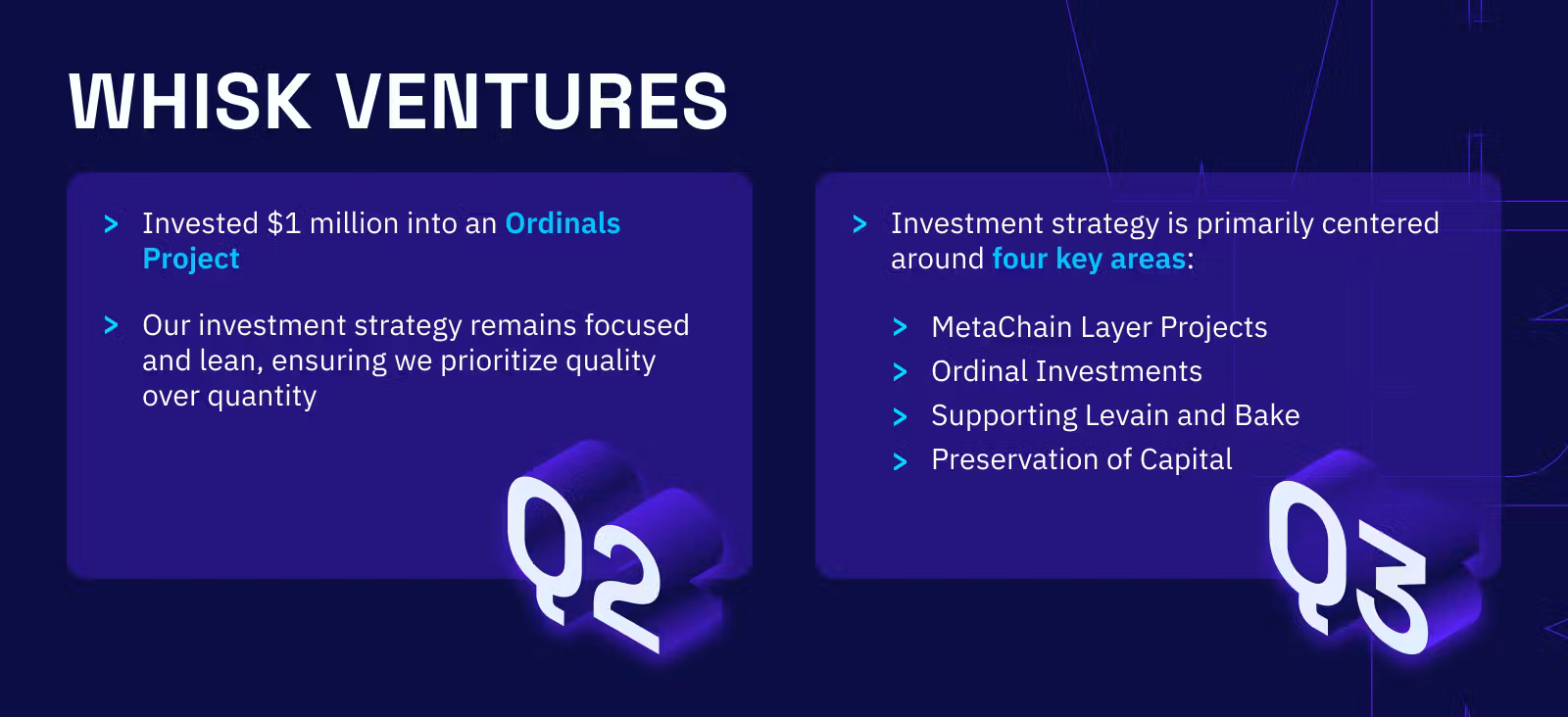 Whisk Ventures (https://whisk.vc) represents our strategic investment wing. In Q2, we invested $1 million into an Ordinals Project, further reflecting our commitment to fostering innovation and growth in the blockchain ecosystem. Our investment strategy remains focused and lean, ensuring we prioritize quality over quantity.