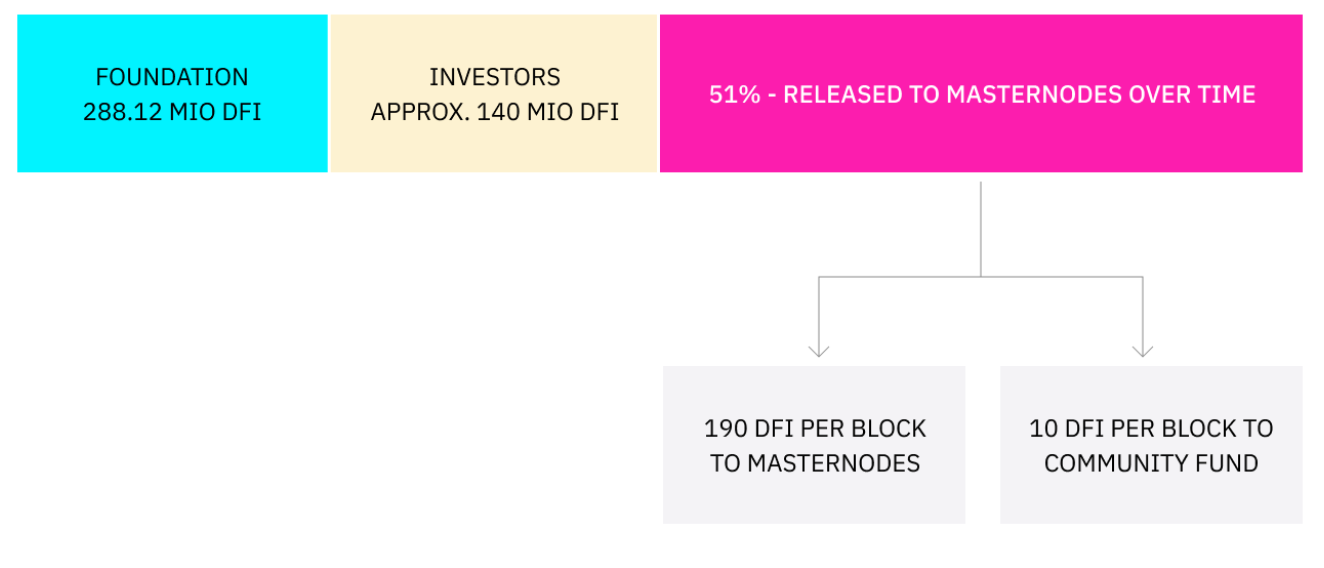 Since DeFiChain mainnet launch in May 2020, the initial token distribution and the DFI issuance structure has changed. In the beginning, 51 percent of the total DFI token supply was reserved for masternode staking rewards and the rest of the total DFI token supply of 1.2b DFI coins was issued to the Foundation (288.12 Mio DFI) and to the team and early investors (approx. 140 Mio DFI coins).
