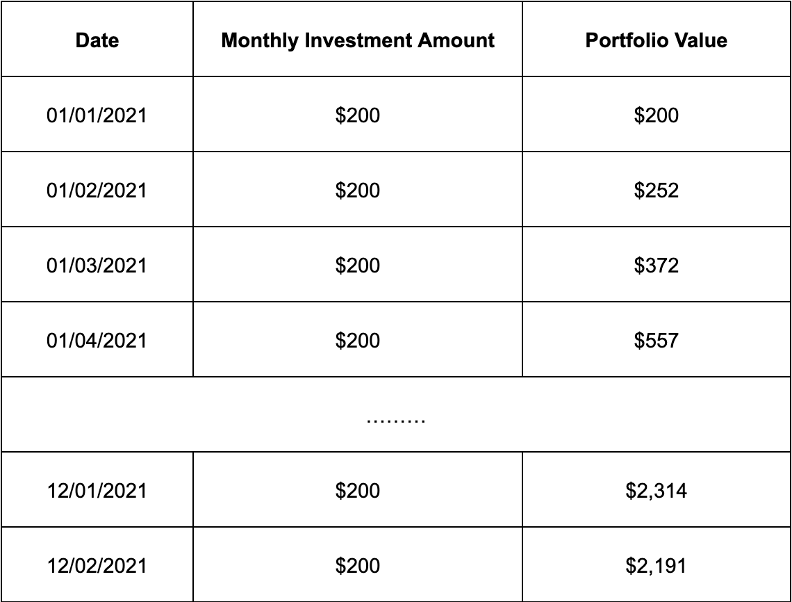 You adopt a cadence of $200 every month and distribute it according to your portfolio allocation. Here’s what your DCA plan looks like: