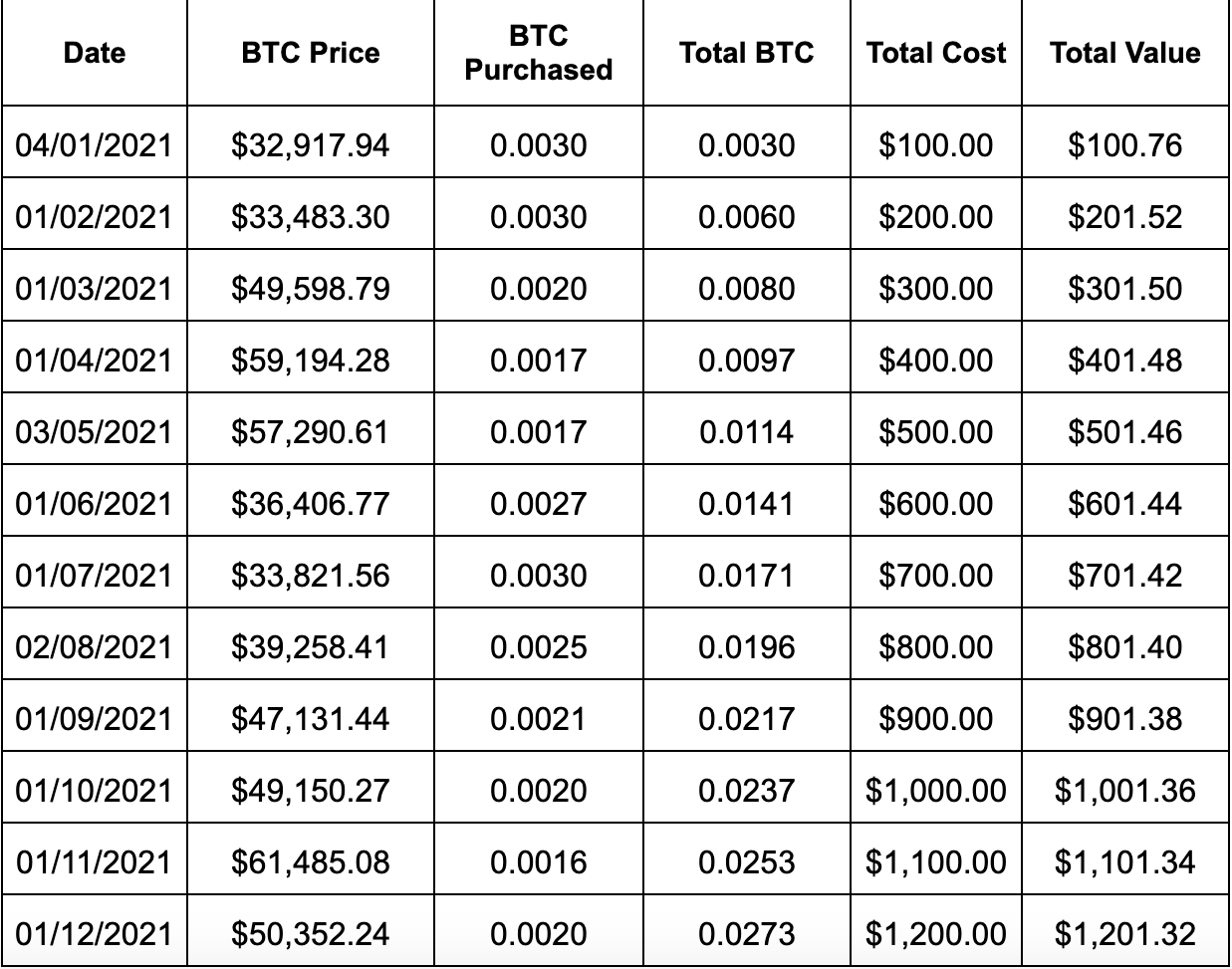 Assuming you bought $100 worth of BTC every month for a year, starting from January 1st, 2021, here's what your DCA plan would look like: