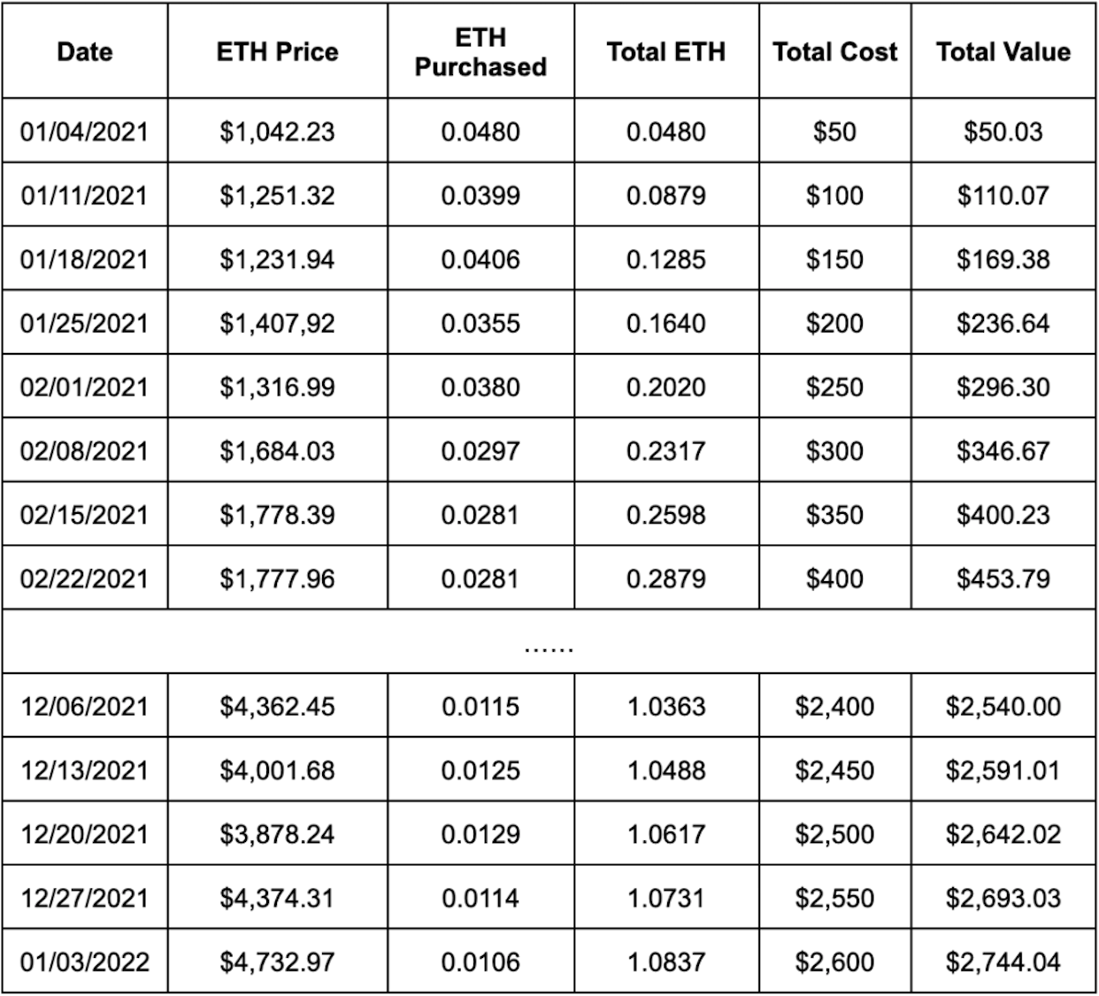 Using DCA, you’d have bought a total of 1.0837 ETH for $2,600, worth $2,744.04 as of January 3, 2022. That’s a profit of $144.04 or 5.54%. Your average cost per ETH would be $1,813.29, which is lower than the average price of ETH during the year ($2,819.92).
