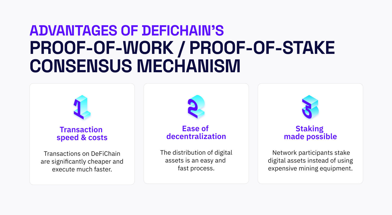 Bitcoin's scalability is quite limited, as it suffers from slow transaction speed and expensive transaction costs on the base layer. For this reason, DeFiChain opted for a hybrid proof-of-stake / proof-of-work consensus mechanism instead of Bitcoin's proof-of-work.