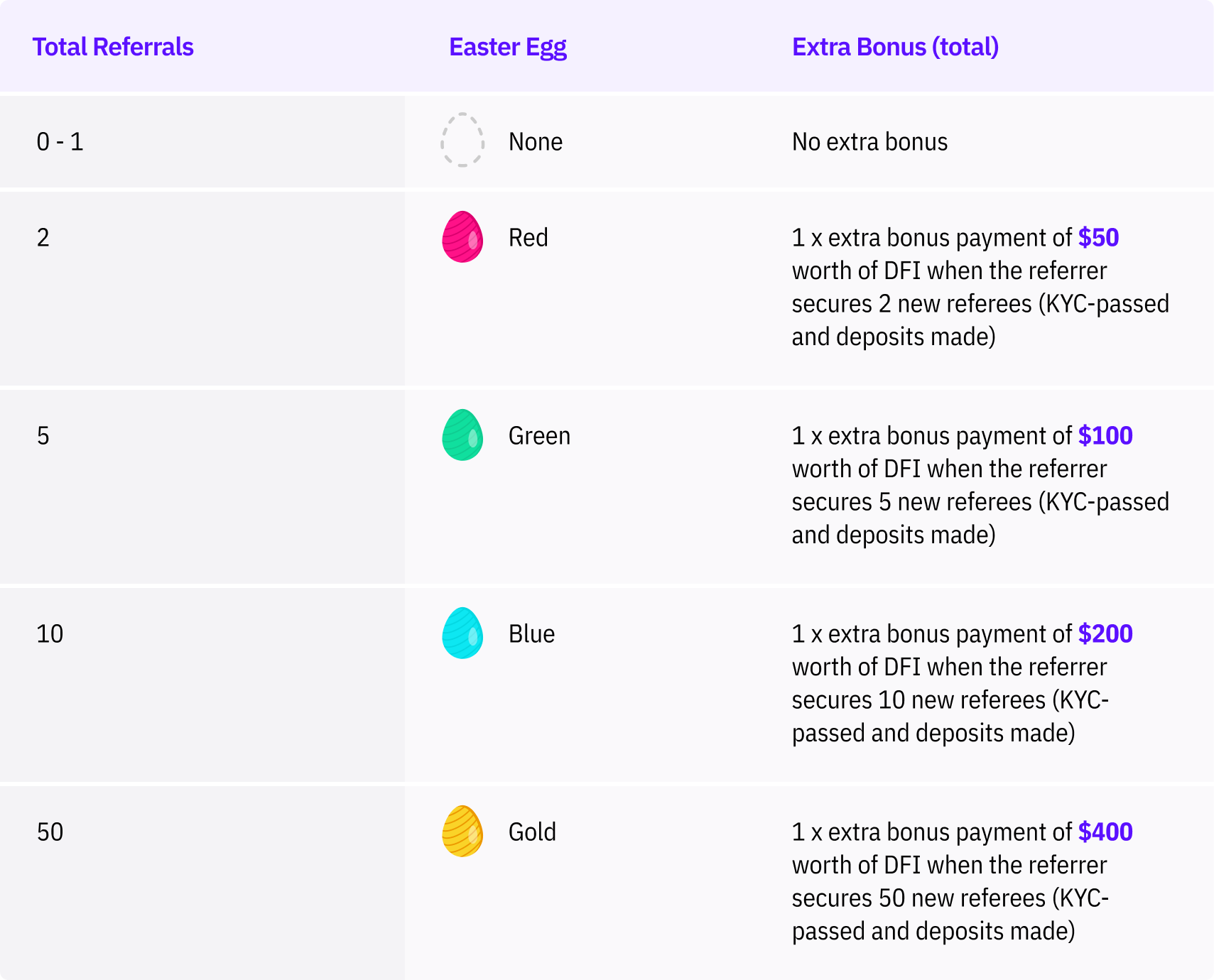 - All users also have the chance of earning up to $750 worth of DFI as added bonuses — by collecting a total of 5 Easter eggs — on top of their referral bonus. If you refer 2 people, then you get a red Easter egg and an additional bonus of $50. If you refer 5 people, then you get a green Easter egg and a bonus of $100, making it a total of $150 in bonuses. If you refer 10 people, then you get a blue Easter egg and a bonus of $200, hence your total extra bonus is $350. If you manage to refer 50 people or more, then you get the golden Easter egg and this special egg comes with a one time bonus of $400, making the total extra bonus payout a whopping $750. All these bonuses are paid out in DFI and automatically allocated to the Freezer product for 180 days.
