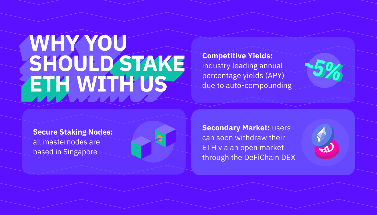 As a result, Cake DeFi will soon offer the possibility for staked ETH to be withdrawn via an open market. This feature will be available shortly after going live with ETH staking and will harness the liquidity of the DeFiChain DEX.