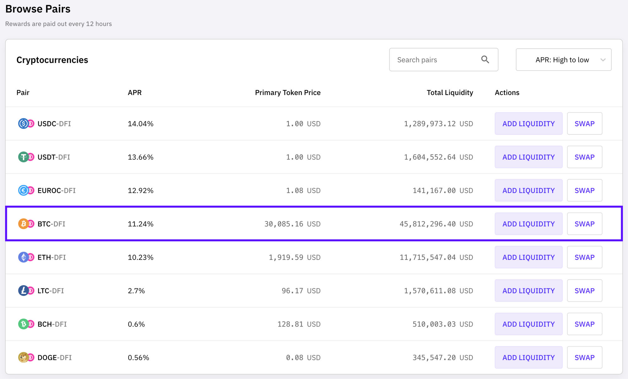 2. Choose the BTC-DFI cryptocurrency pair.