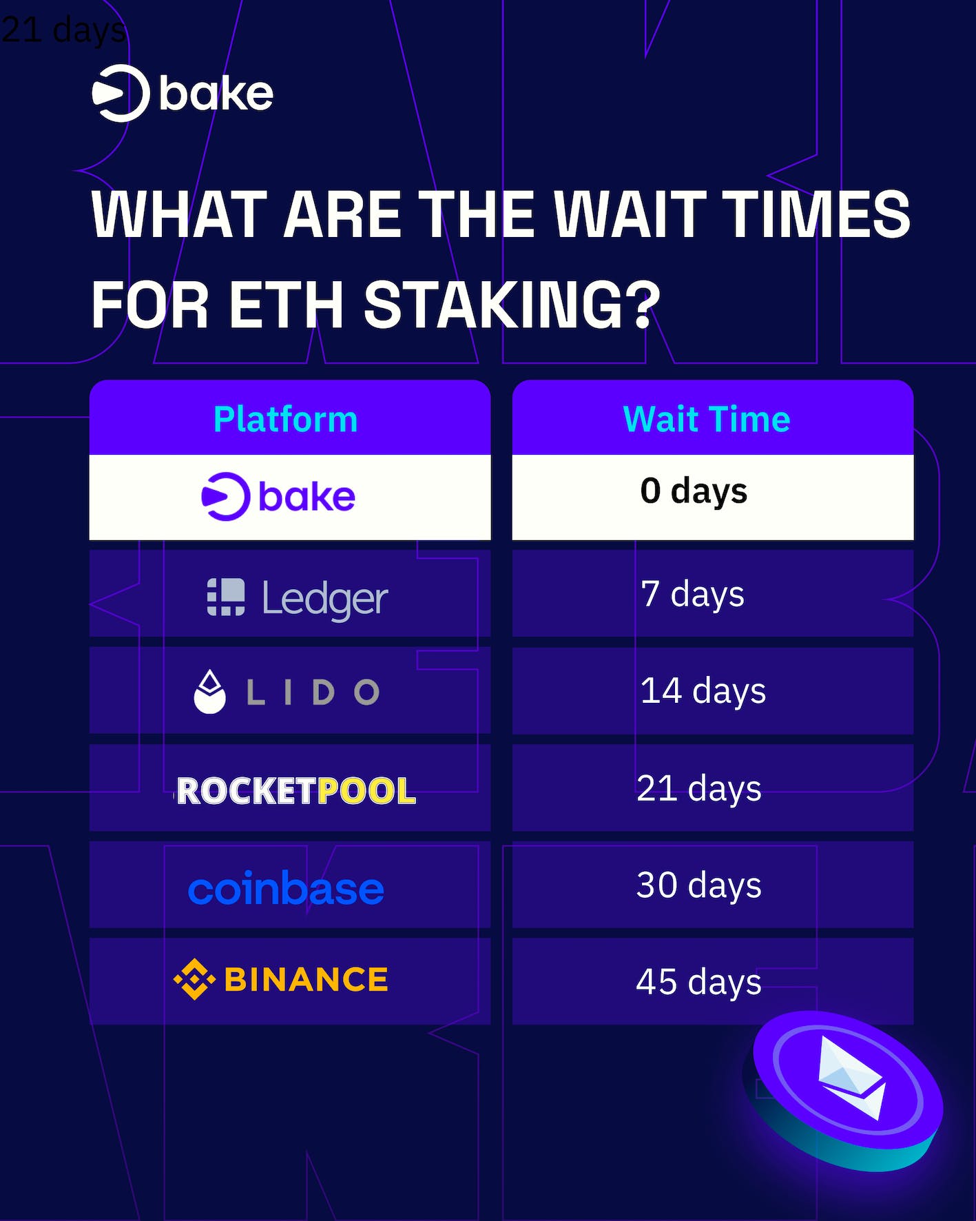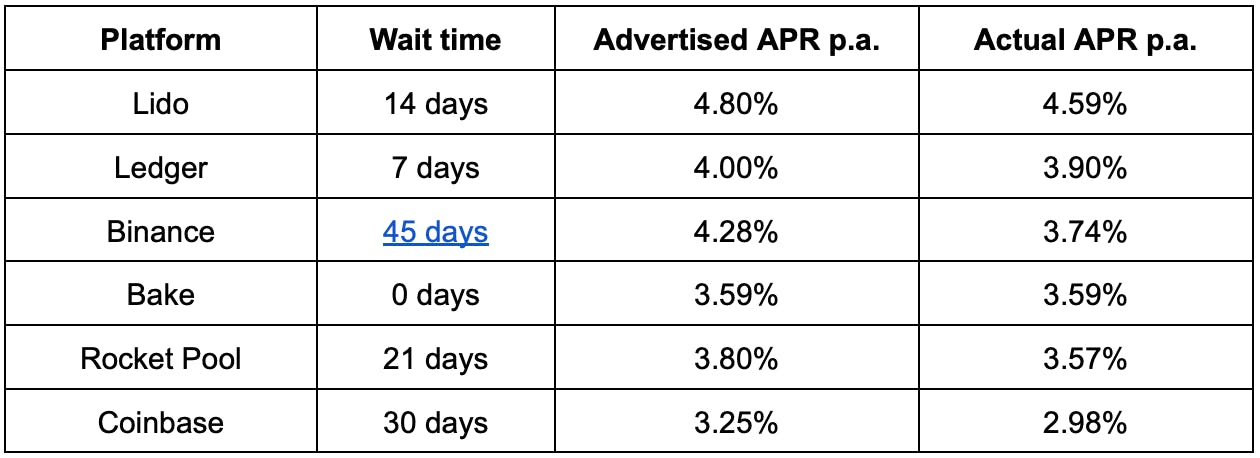 While all platforms (except Bake) have a waitlist, you can instantly stake your ETH on Bake and get a 45-day head start on your staking returns. So how much is 45 days of staking really worth when you compare other platforms paying a higher yield, but longer wait times?
