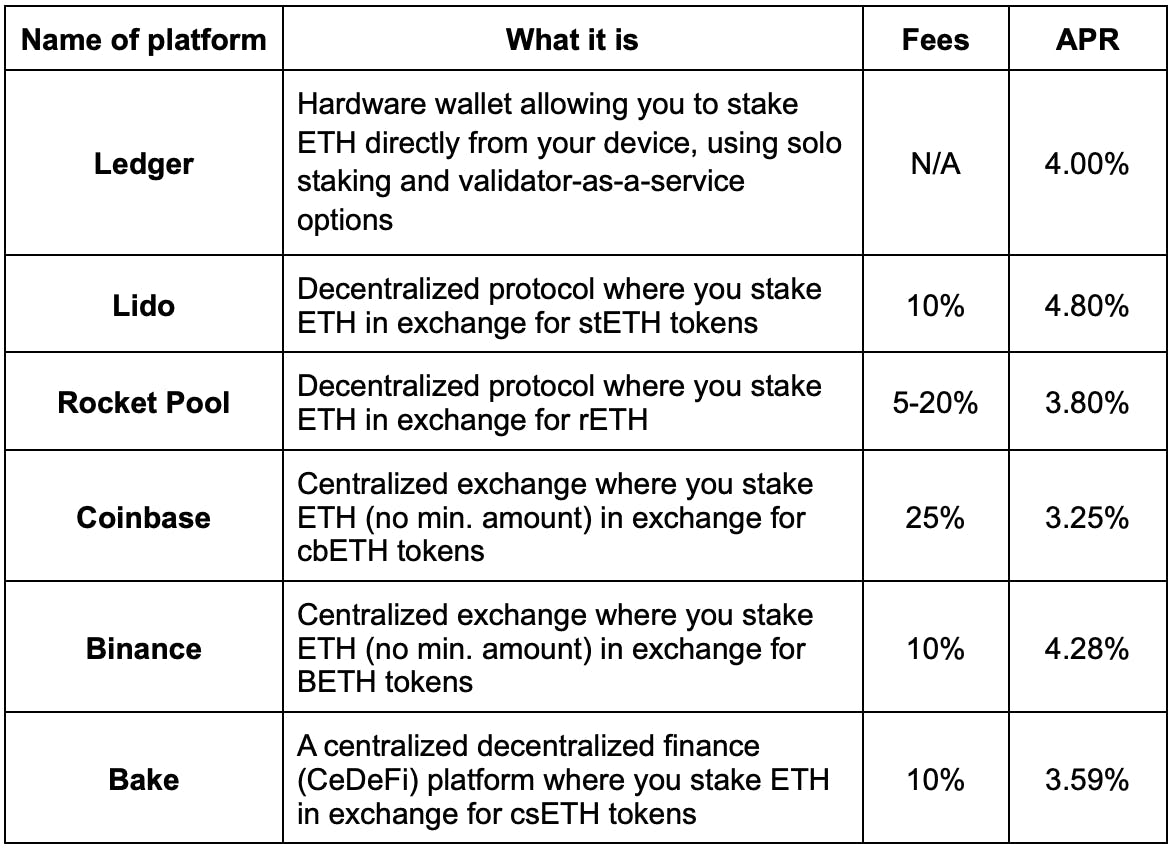 ETH staking is offered by various crypto platforms as a core service, and there are several providers in the market today, including Coinbase and Binance. Below is an overview of the most popular ETH staking options available: