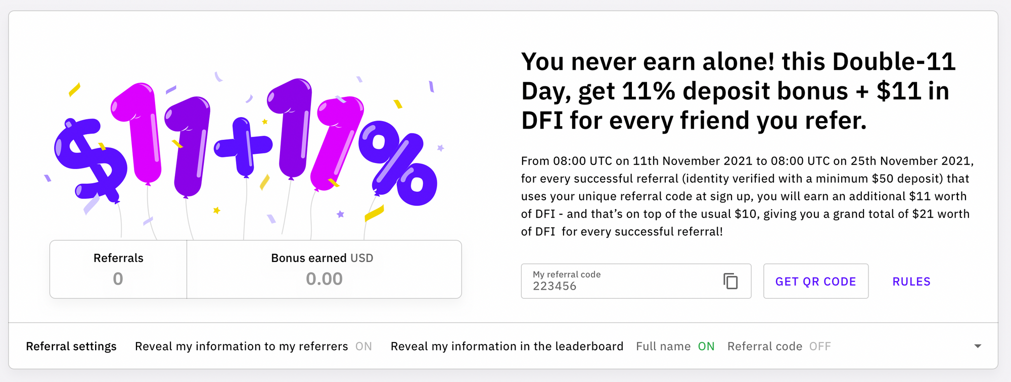 Fedeli al motto "Non si guadagna mai da soli", stiamo dando a te –– i nostri fedeli pasticcieri - la possibilità di guadagnare bonus di referral aumentati dalle 05:00 UTC dell’11 novembre 2021 alle 05:00 UTC del 25 novembre 2021. Per ogni raccomandazione avvenuta con successo (identità verificata con un deposito minimo di 50$) che utilizza il tuo codice di raccomandazione unico al momento dell'iscrizione, riceverai altri 11$ in DFI! E questo si aggiunge al regolare bonus di $10, quindi per ogni referral riuscito riceverai un totale di $21 in DFI!