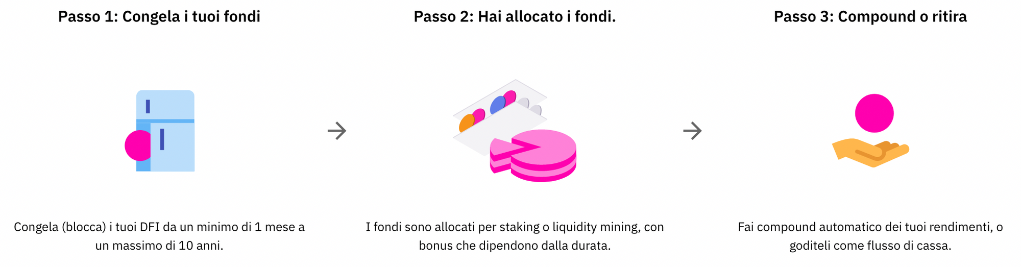 Alice è ancora una studentessa, vive a casa e vuole investire solo 1.000 quote BTC-DFI. Bob, invece, ha risparmiato per tutta la vita ed è disposto a investire 100.000 quote BTC-DFI nel "Liquidity Mining Freezer". Entrambi hanno la possibilità di ritirare i loro rendimenti o di reinvestirli e compoundarli (Figura 1).