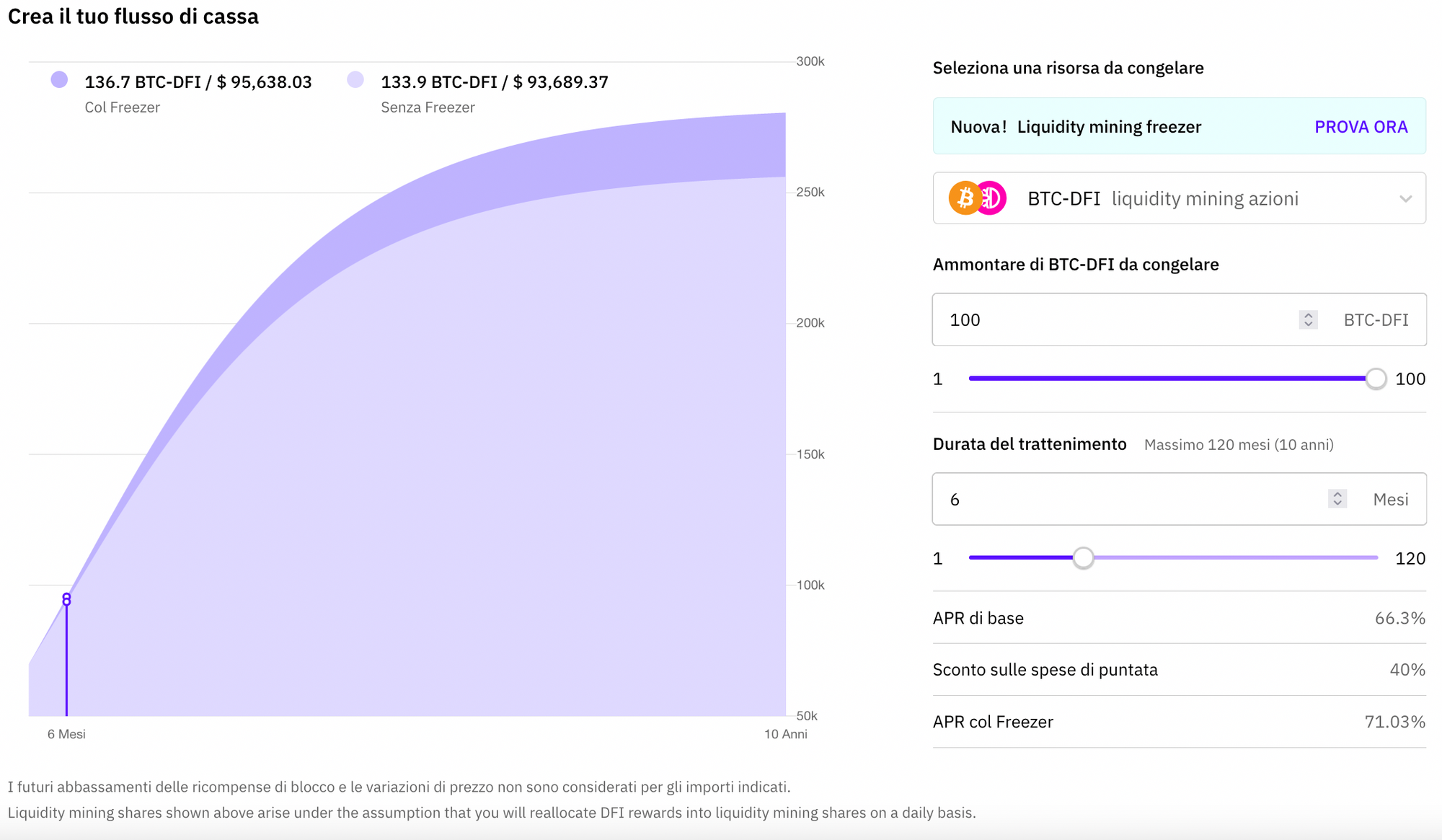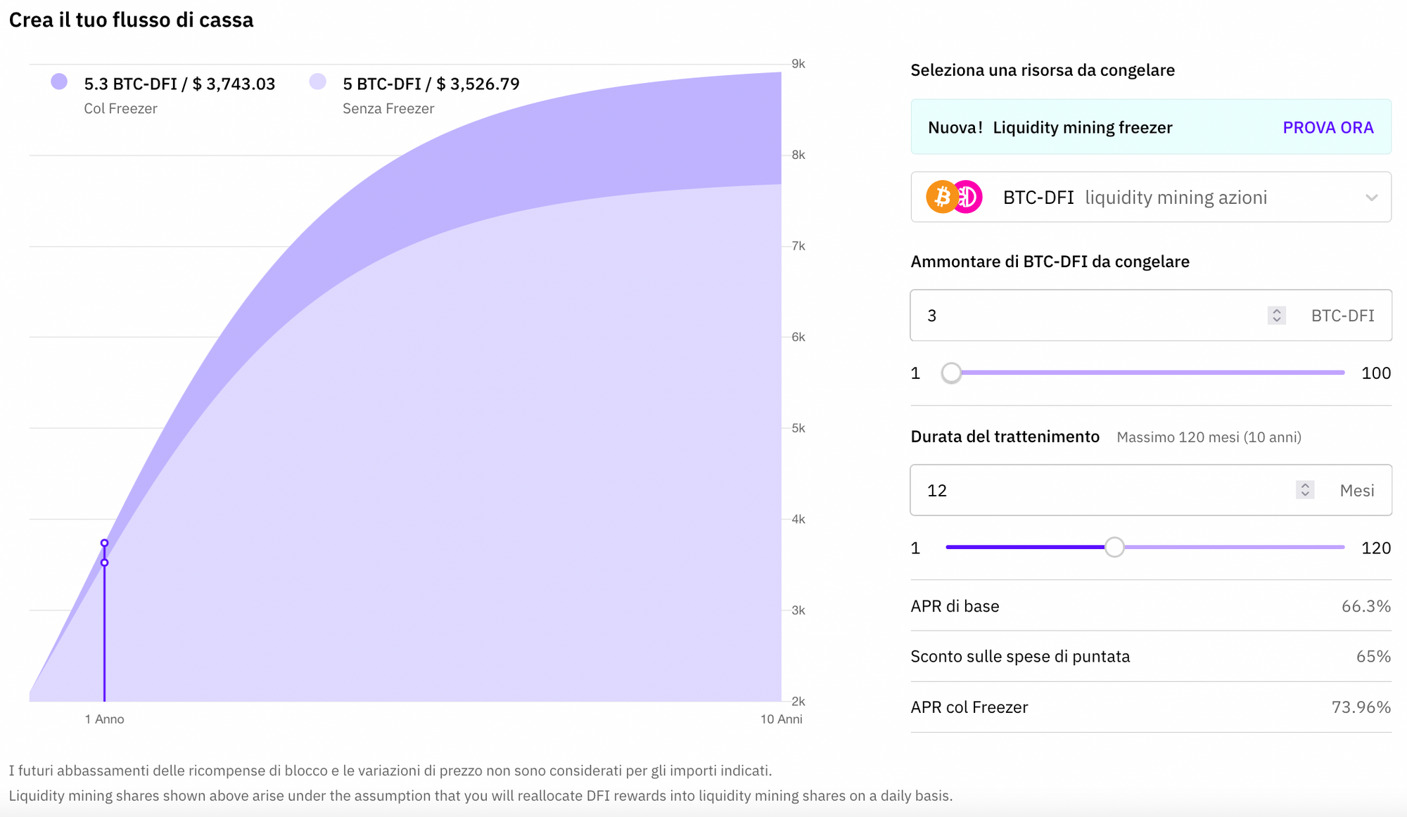 La figura 2 mostra che Alice riceverebbe quasi 5 quote di BTC-DFI mettendo i suoi 3 BTC-DFI nel Liquidity Mining per 12 mesi. Tuttavia, se decide di bloccare il suo BTC-DFI per 12 mesi usando il 'Liquidity Mining Freezer', allora guadagnerebbe altri 0,3 quote di BTC-DFI ($217) in più.
