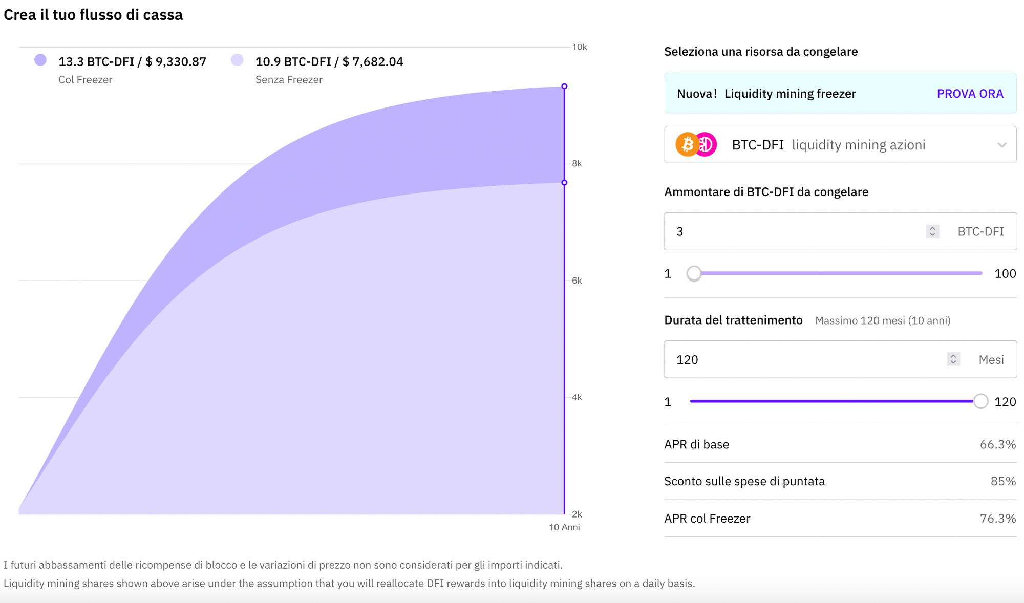 Tuttavia, se si aggiunge il proprio BTC-DFI nel Liquidity Mining Freezer per 10 anni, allora si otterrà un ulteriore 85% di sconto sulle commissioni di liquidity mining (Figura 3). La differenza rispetto al solo liquidity mining senza il freezer dei beni è enorme! In questo modo Alice riceverebbe un considerevole sconto di 2,4 quote di BTC-DFI ($1,648) – proprio così! Se Alice dovesse iniziare a pensare ai guadagni e ai benefici a lungo termine, congelando le sue 3 quote di BTC-DFI per 10 anni, potrebbe godere dei rendimenti extra.