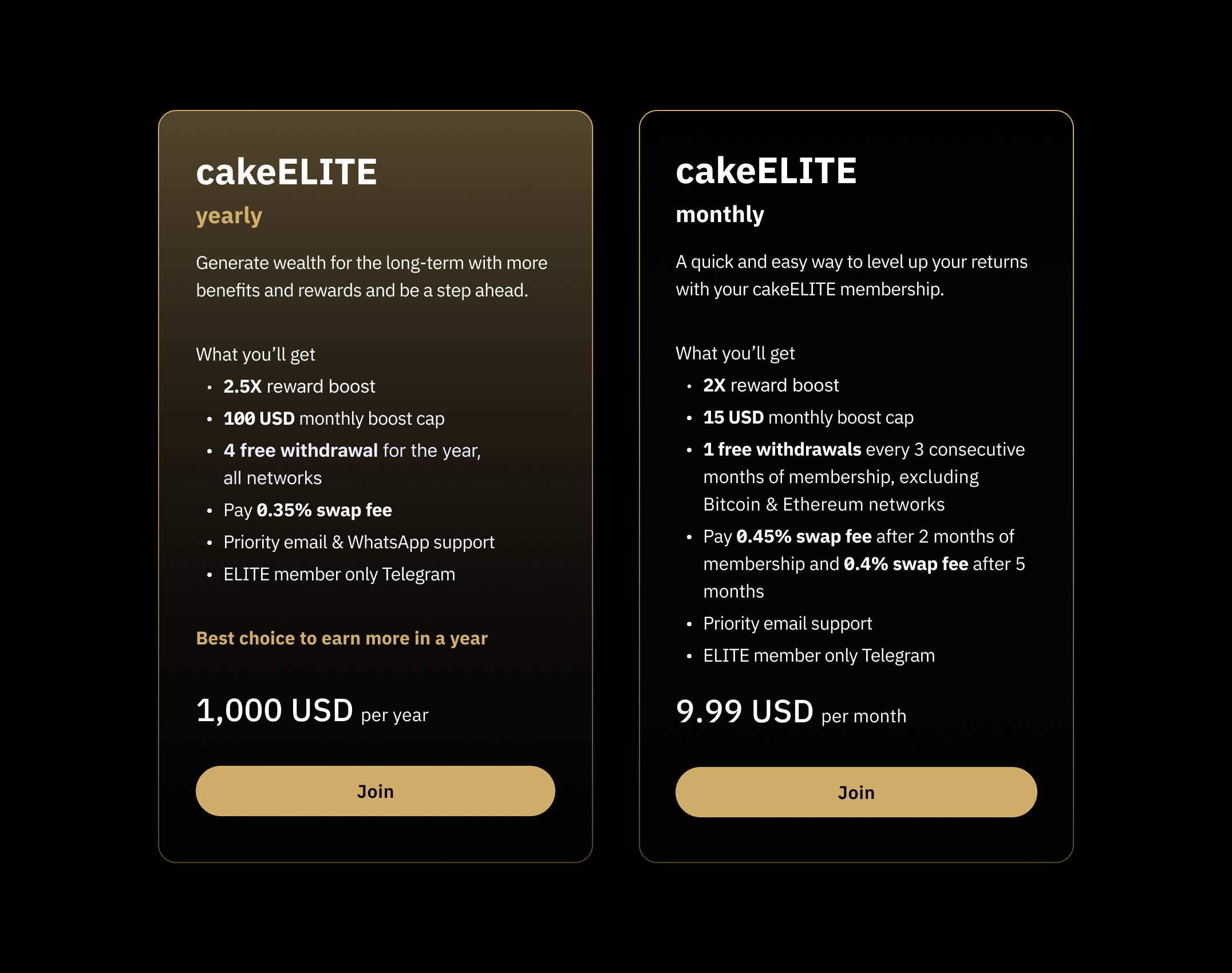 As a member of cakeELITE, you’ll receive a multiplier on the crypto rewards that you earn from our services. That means more passive income and even greater growth of your cryptocurrency holdings over time.