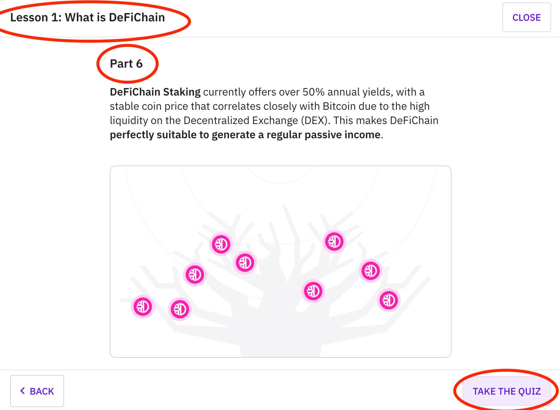 Each of the five lessons is divided into six small subsections, dealing with specific elements of the project. At the end of each lesson, you will find the option to test your accumulated knowledge by taking part in a multiple-choice quiz. For each quiz you complete and pass, new customers — who have not yet completed their KYC process — as well as a limited number of existing customers, will receive $0.2 in DFI paid directly into your Cake DeFi account. In completing all 5 quizzes, you can earn a total of $1 per course.