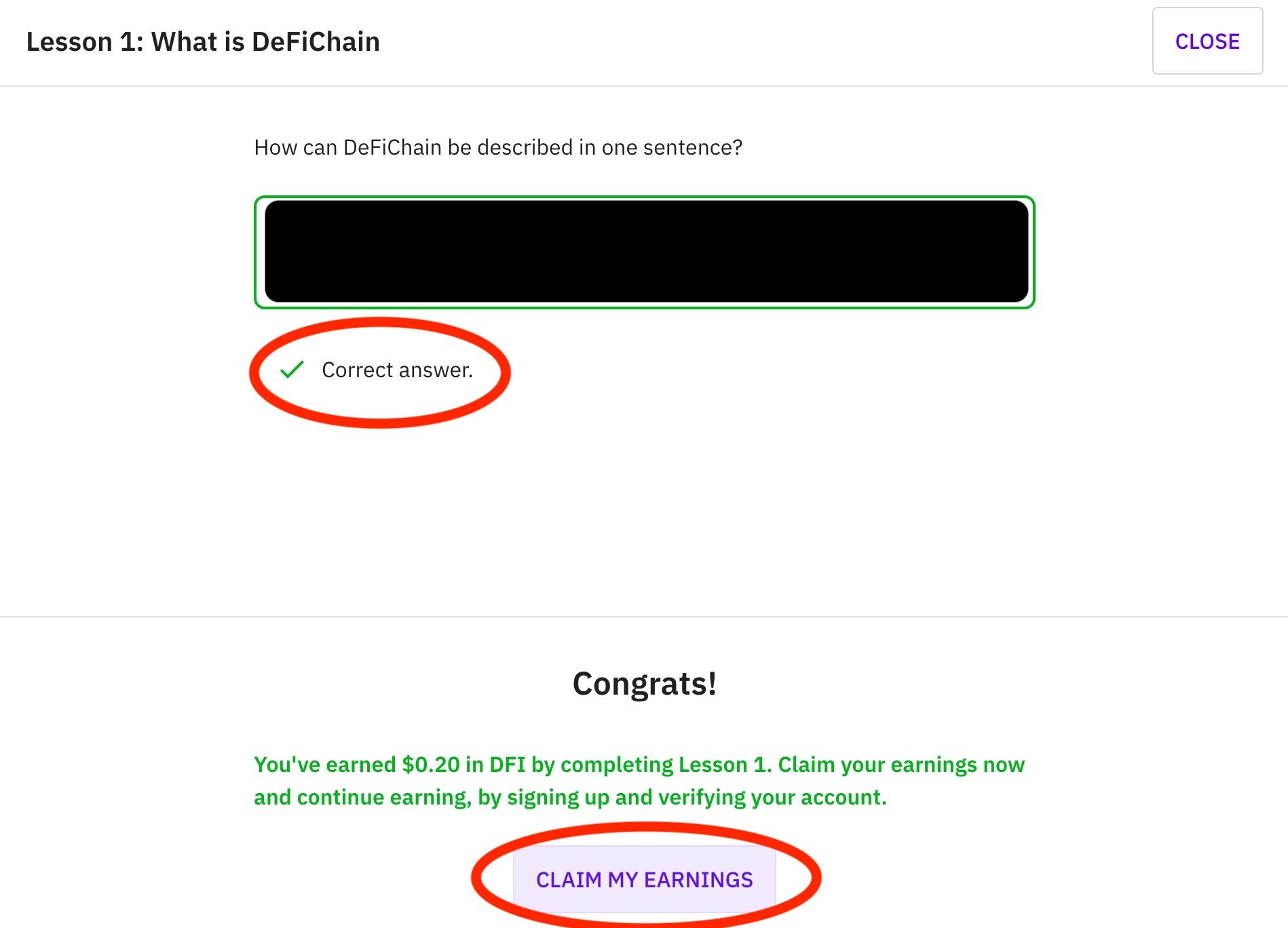 8. Congratulations, you just earned $1 in DFI! Share the good news with your friends and help them learn & earn, too.