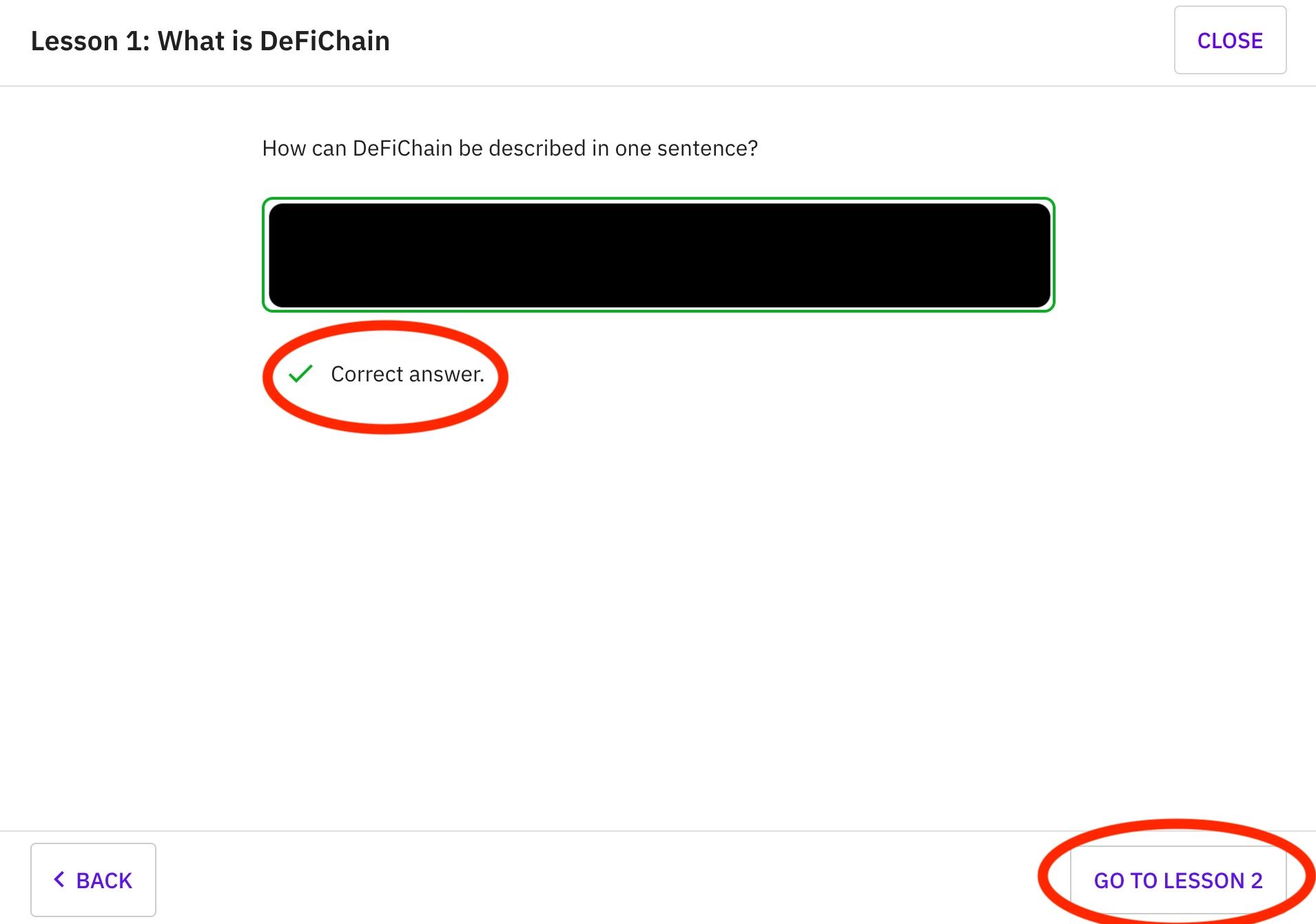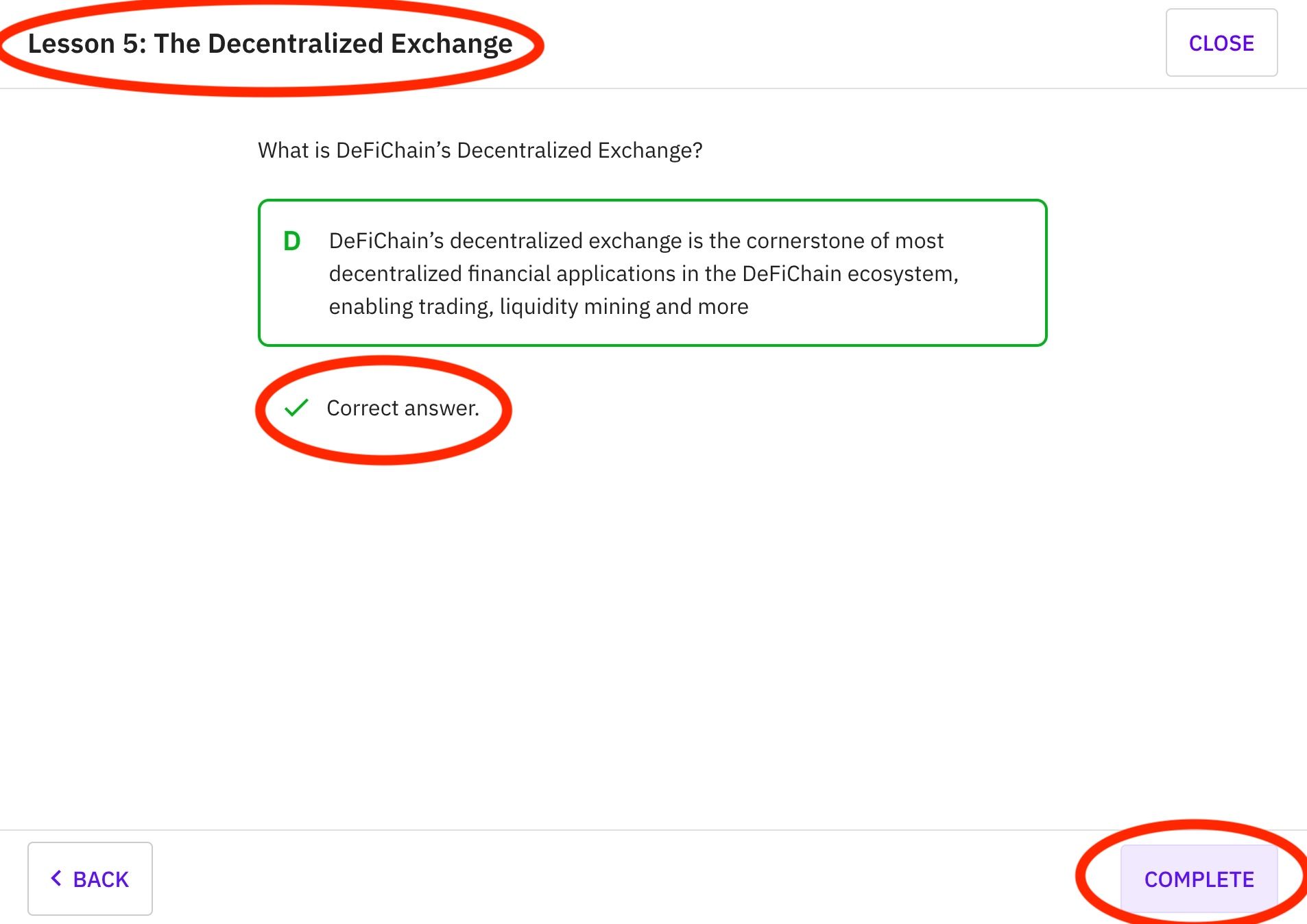 7. Go through all 5 Lessons to claim your rewards, totalling in a $1 DFI reward. Click on "Complete" to finish the course.