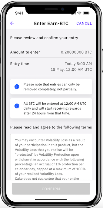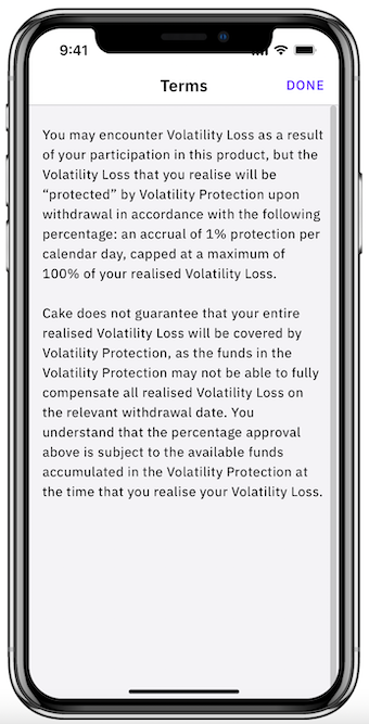 - Rewards will be paid out every 24 hours, minus Cake DeFi’s fees and a fixed percentage of which will be contributed to the volatility protection pool, and are automatically reinvested for the user's convenience. These rewards will be in the same type of cryptocurrency that the user allocates.
