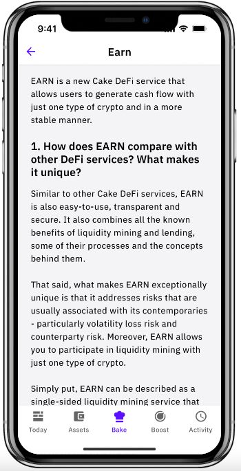 Similar to other Cake DeFi services, EARN is also easy-to-use, transparent and secure. It also combines all the known benefits of liquidity mining and lending, some of their processes and the concepts behind them.