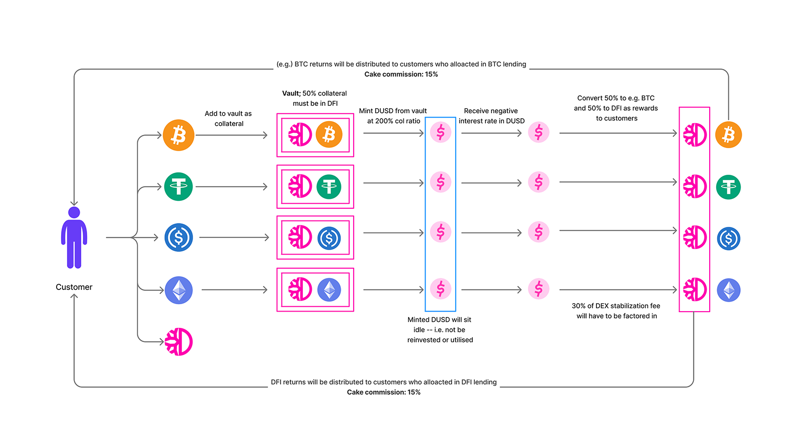If you invest other coins than DFI, DFI will also be deposited into the vault as collateral (50% of the collateral has to be in DFI based on the mandate to mint DUSD from a vault) – the user does not have to do anything as this is handled by Cake DeFi.