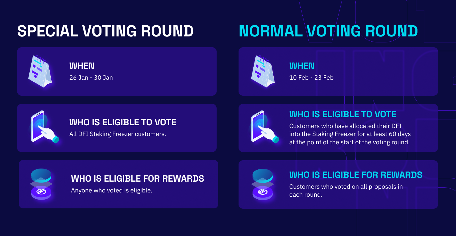 The eligibility criteria for rewards in the special DFIP voting round is simple: anyone who voted is eligible. However, for the normal voting round, customers must vote on all proposals in each round (voting form or whatever format will be sent to eligible voters) to be eligible for rewards.