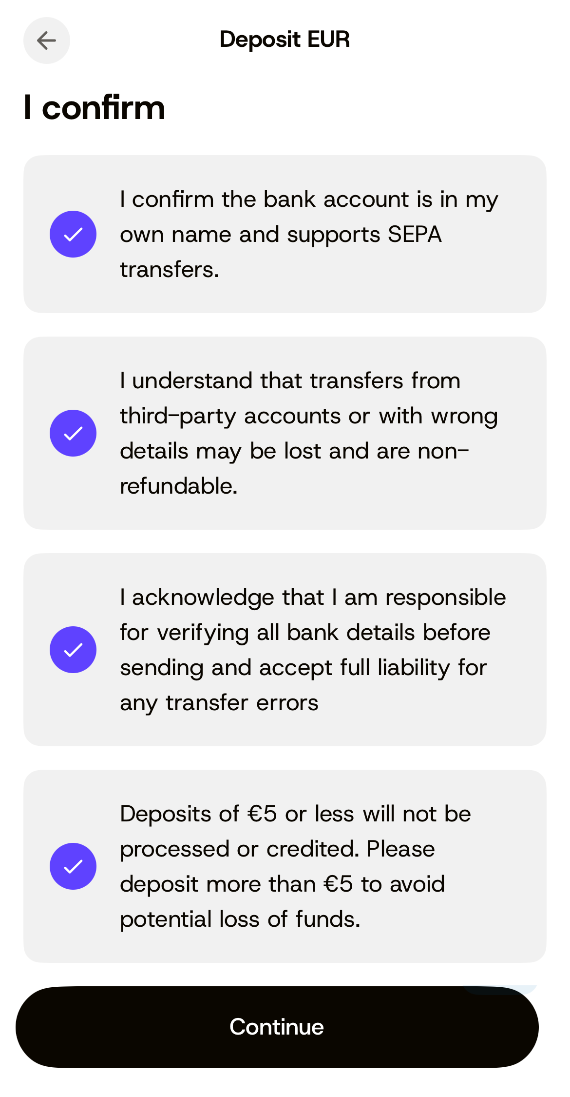 Read all the points carefully in the next step and confirm to avoid issues with your deposit. Then tap “Continue”.