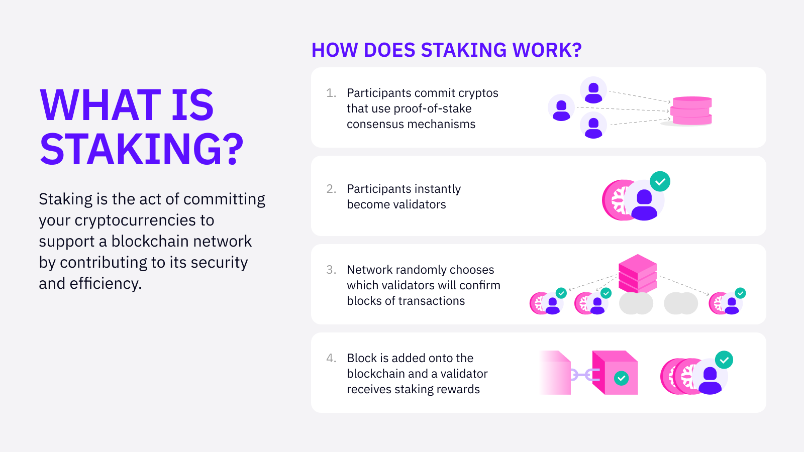 True to its literal meaning, staking is the act of committing your cryptocurrencies to support a blockchain network by contributing to its security and efficiency. How does staking do that? By staking their cryptos, participants help strengthen the blockchain’s ability to process and verify transactions, thus, allowing it to run smoothly and become resistant to malicious attacks.