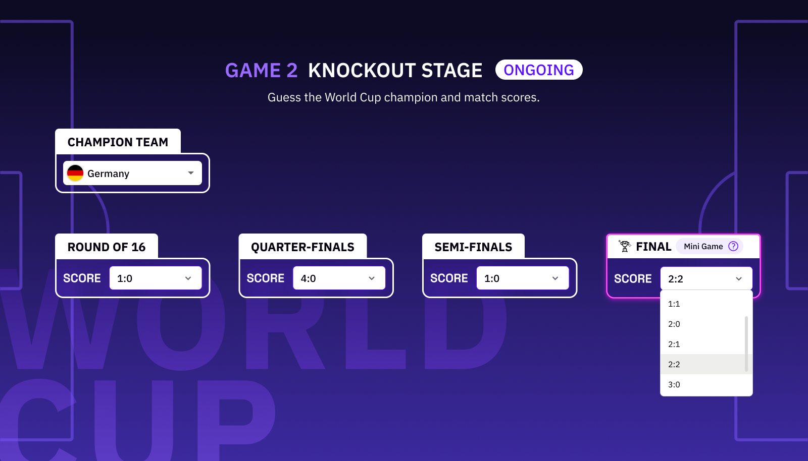 - Accurately guess which team will emerge as this year’s World Cup champion and the team’s match scores during the Knockout Stage