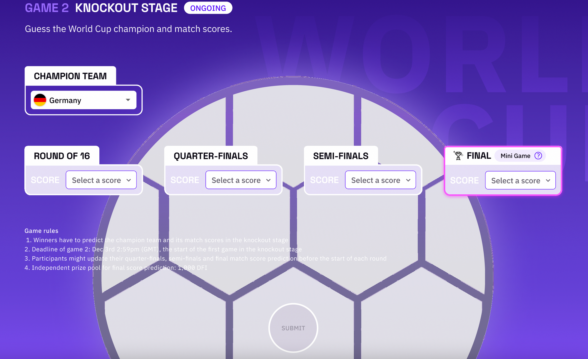 - A share of a 1,000 DFI prize pool for accurately guessing the final game score only