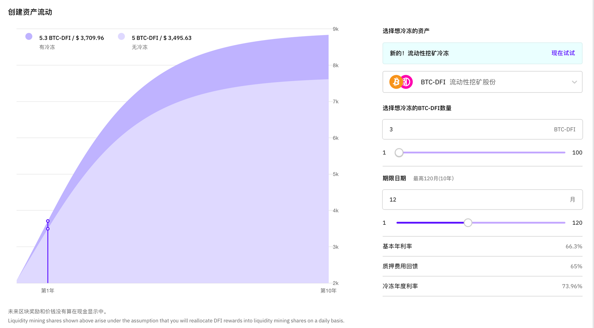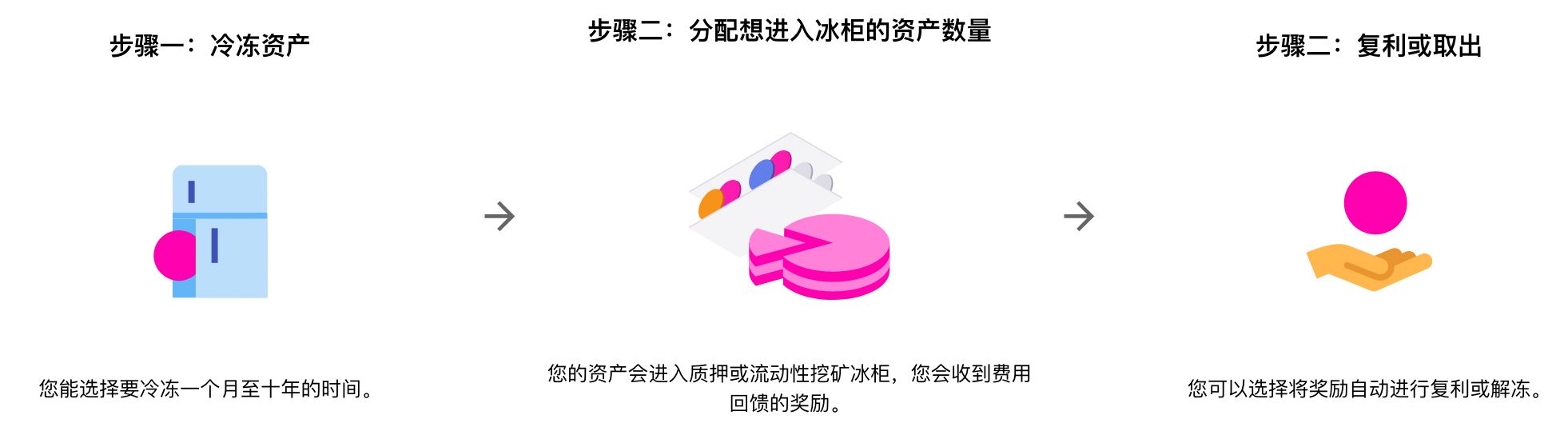 即将推出的「流动性挖矿冰柜」能在各位用户的「冰柜计划」页面设置想入冰柜的时期,最低是一个月,最高可长达10年,只需要输入数量就可调整。入冰柜计划的期间也能收到我们公司为您提供服务的费用回馈,让您提高整体收益率。
