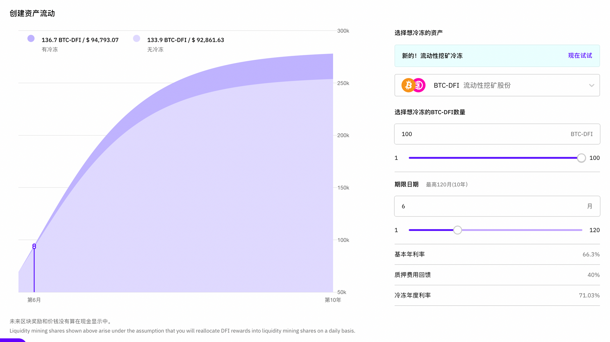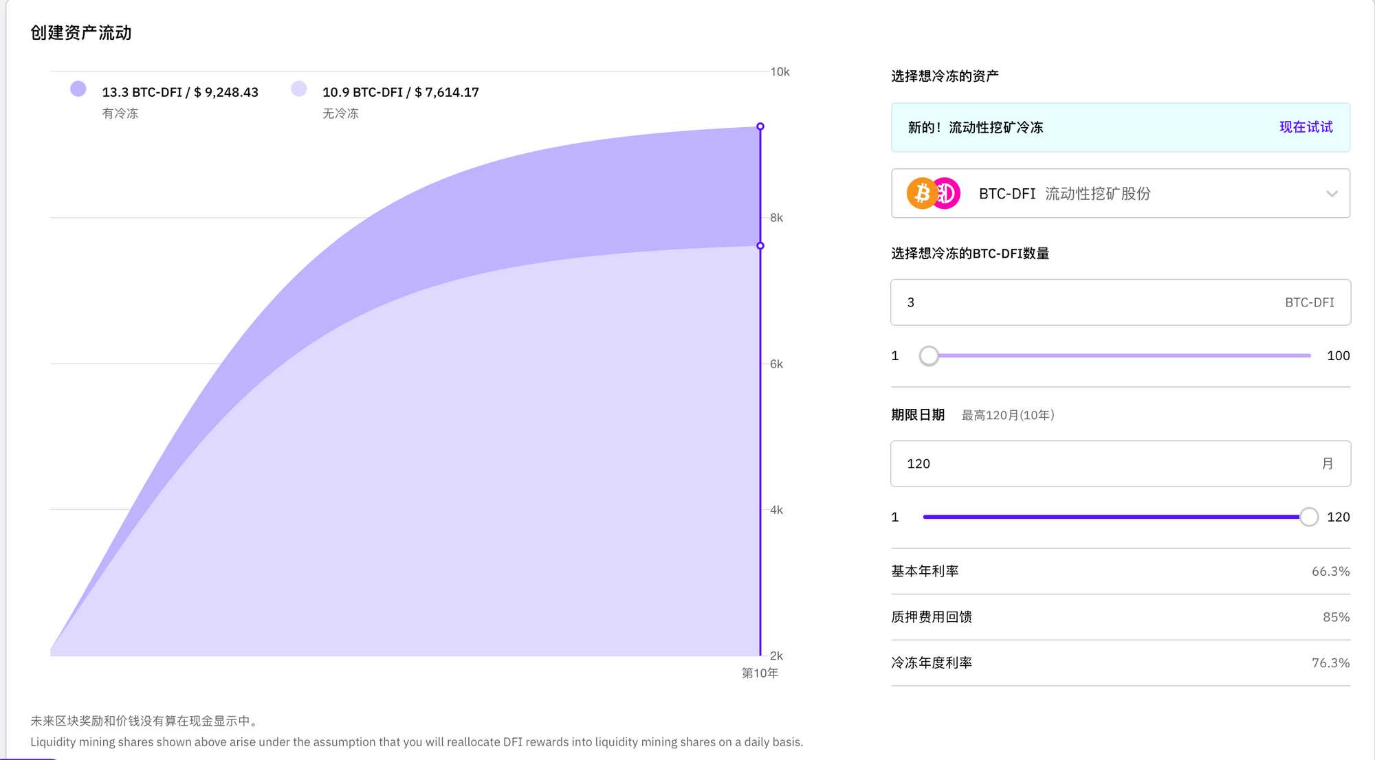 如果爱丽丝把这些股份投入冰柜中的BTC-DFI流动性挖矿成对,在冷冻10年的状态下获得费用回馈(相当于85%的折扣,图三)。这个费用回馈与普通流动性挖矿的回报比较下有可观的差距。以今天DFI的价格相当于是19,850美元值的差距!如果爱丽丝开始考虑长期收益和利益,通过冻结其1000股BTC-DFI股份10年,她能享受额外的奖励回报。