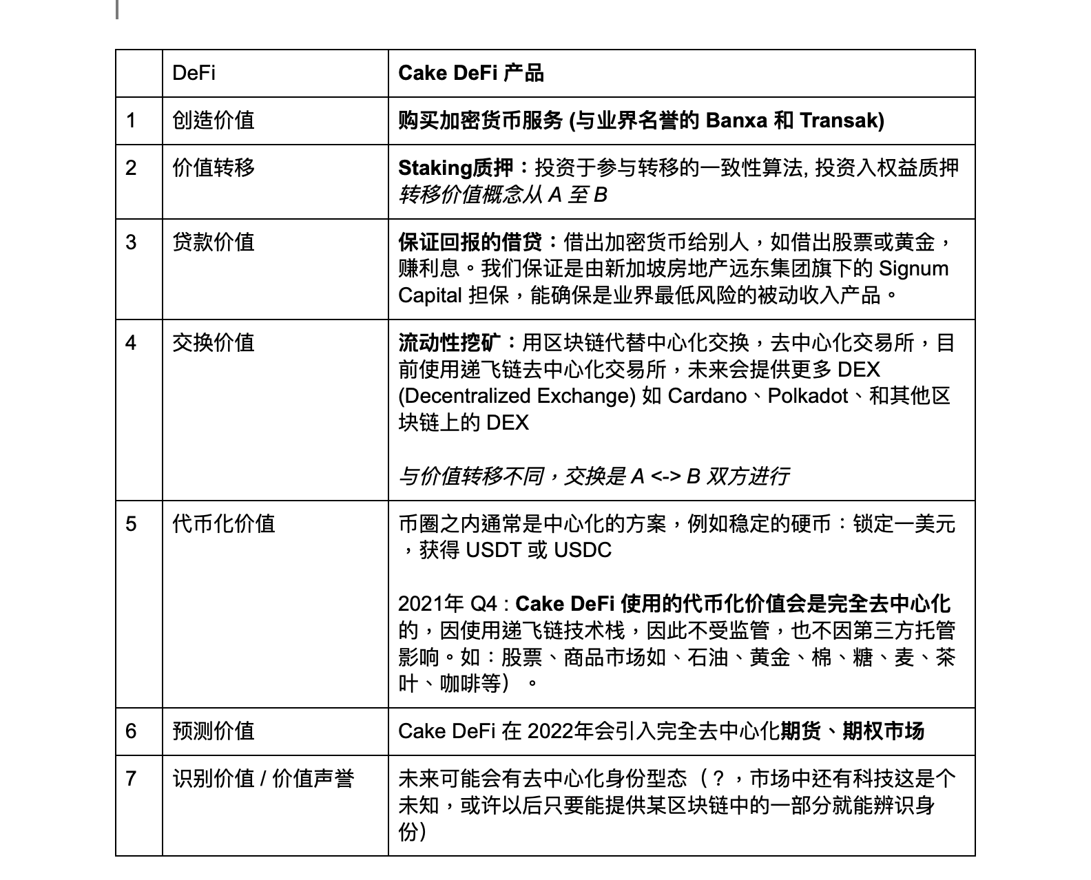 以下表格显示出了 DeFi 的七大功能和 Cake DeFi 以金融公司的方式提供简单化 DeFi 服务