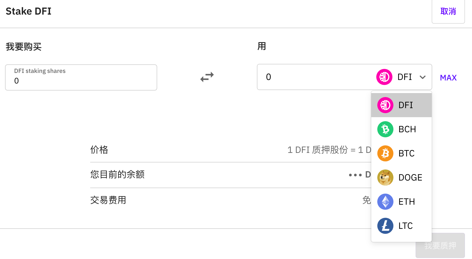 - 在质押页面中转换货币为质押股份,请见以下步骤: