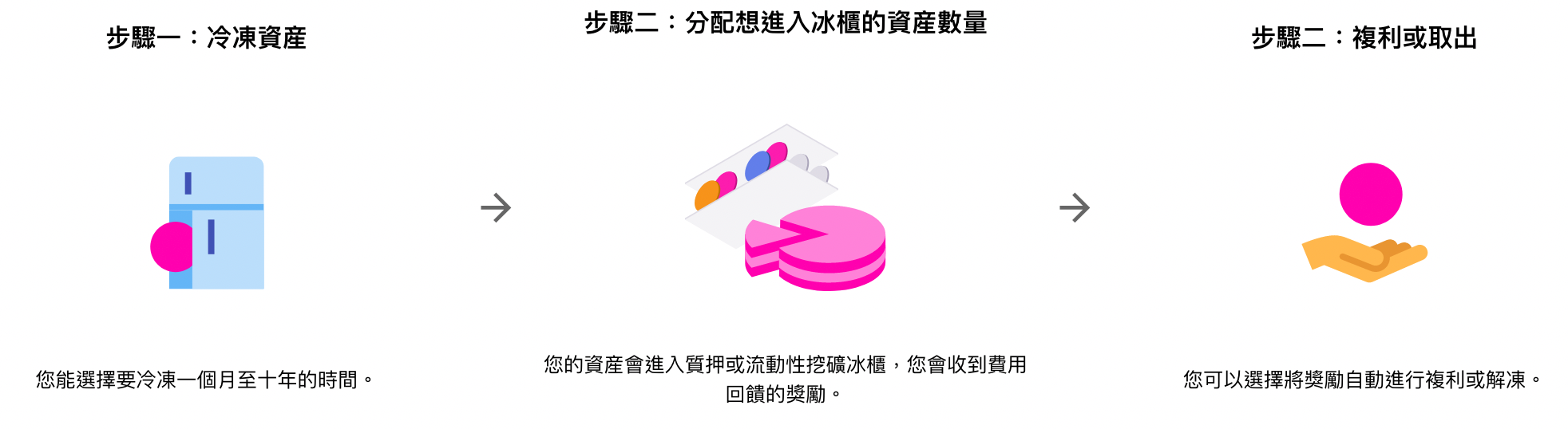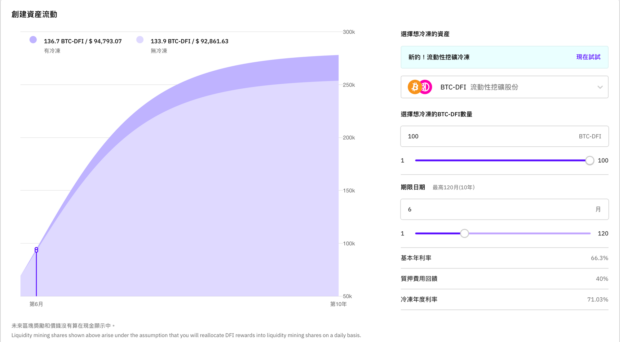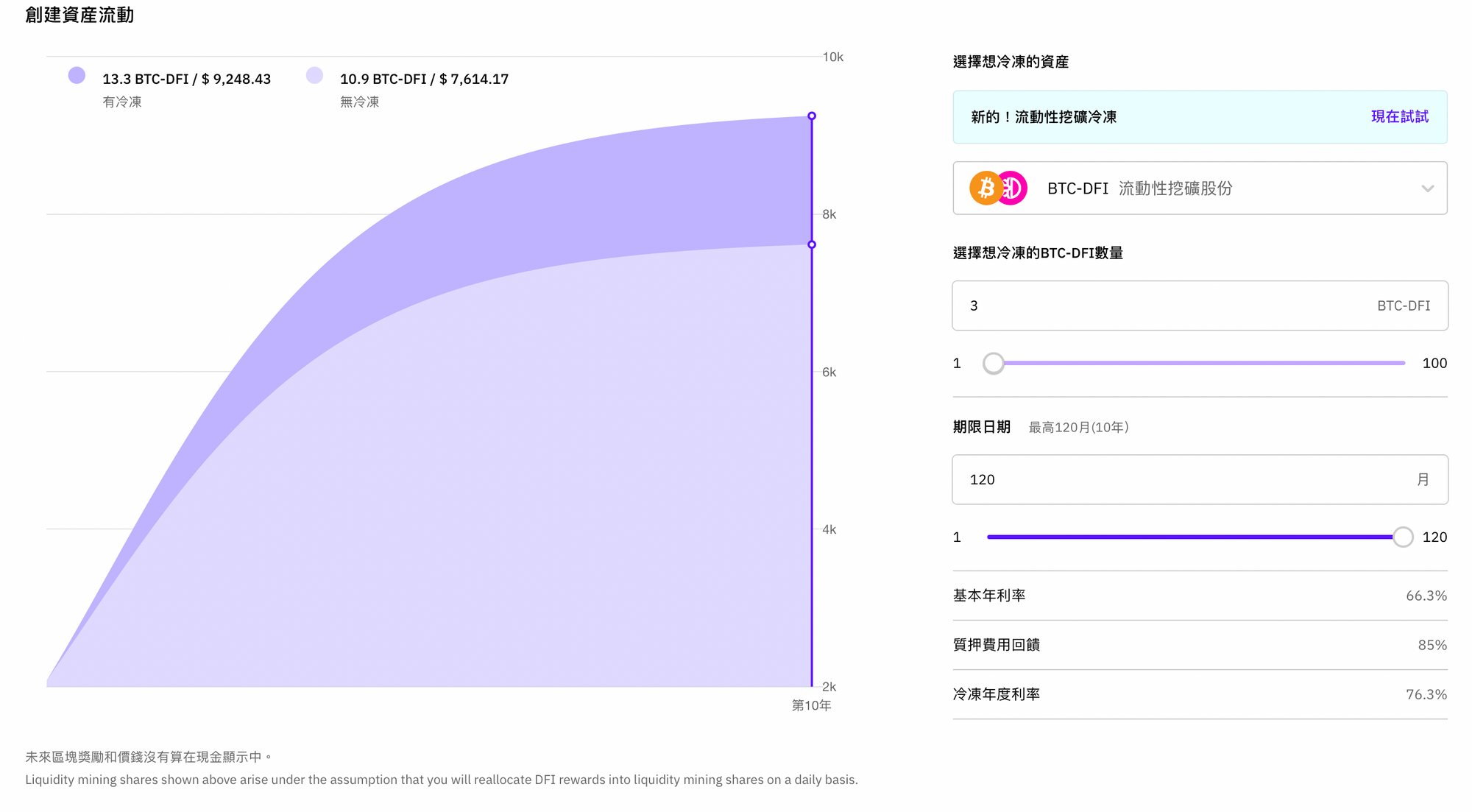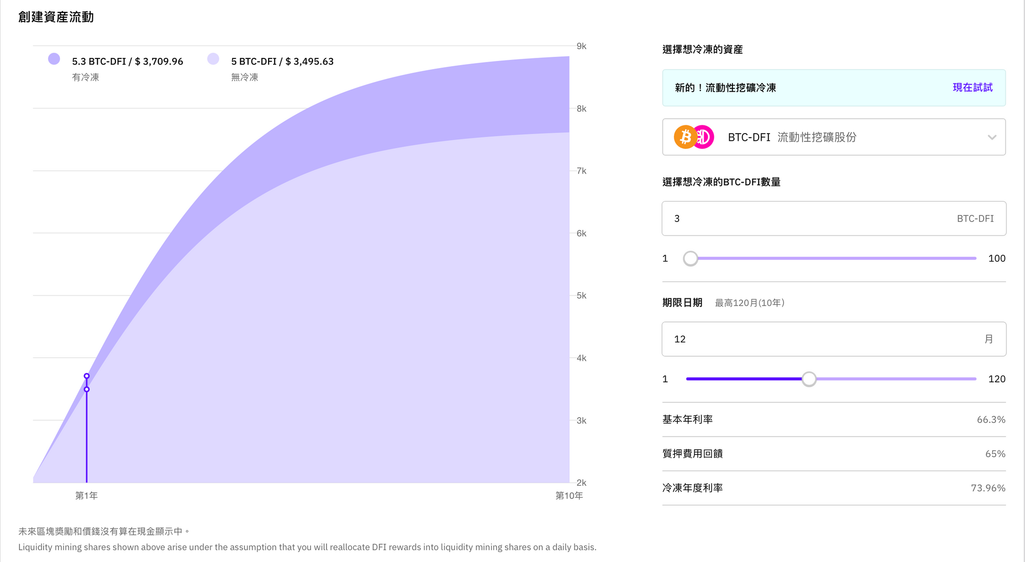 即將推出的「流動性挖礦冰櫃」能在各位用戶的「冰櫃計劃」頁面設置想入冰櫃的時期,最低是一個月,最高可長達10年,只需要輸入數量就可調整。入冰櫃計劃的期間也能收到我們公司為您提供服務的費用回饋,讓您提高整體收益率。