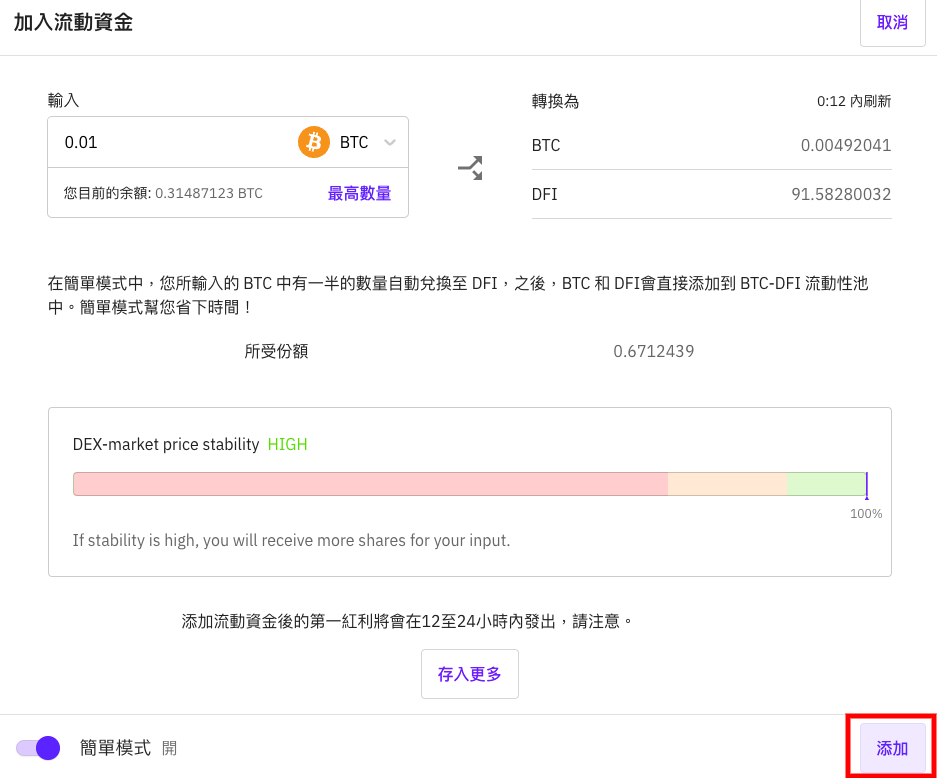 5) 選擇資金數量,貨幣會自動化依比例調整兩方所需的資金