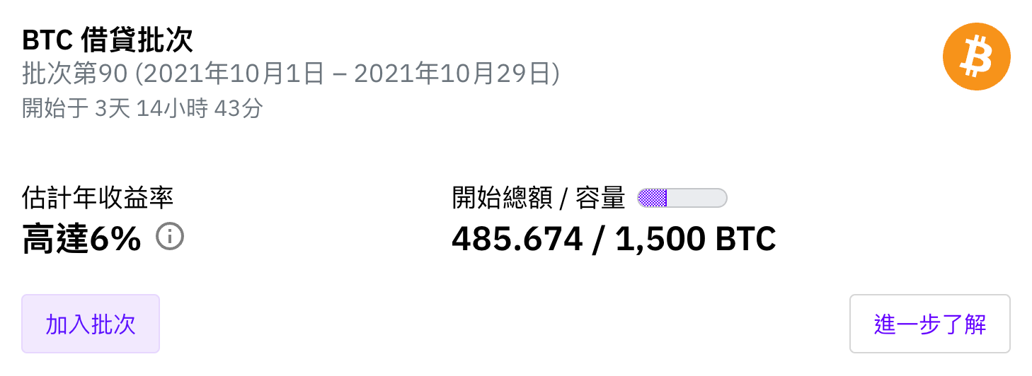 - 您可以任選想參與借貸批次的任何 BTC / ETH / USDT / USDC 數量,沒有限制。
