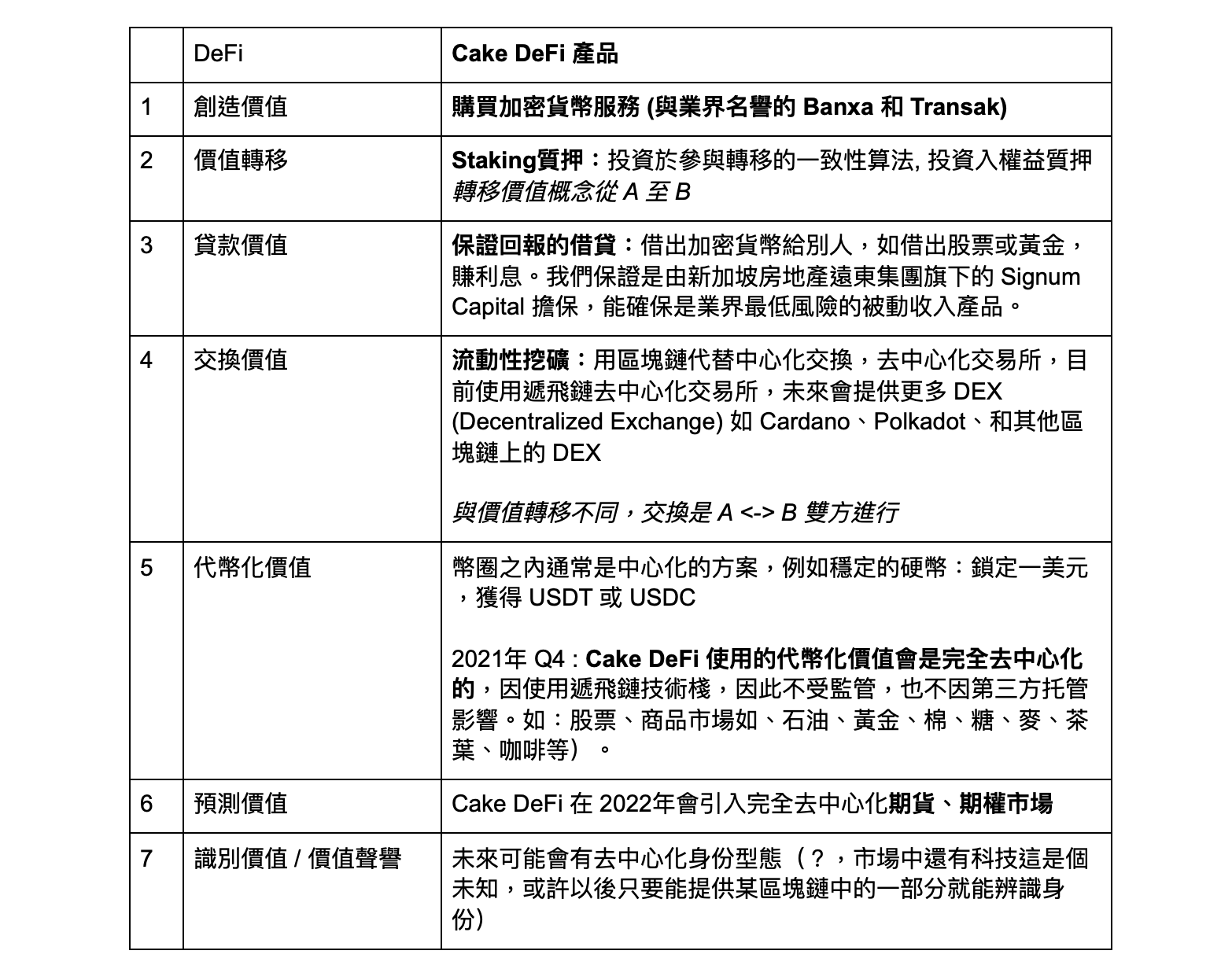 以下表格顯示出了 DeFi 的七大功能和 Cake DeFi 以金融公司的方式提供簡單化 DeFi 服務