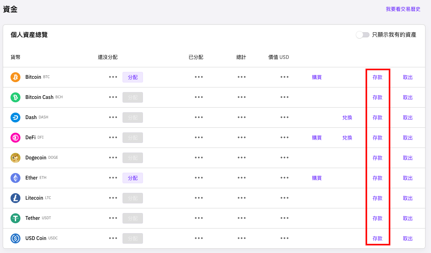 您可以在資產餘額頁中找到您購買或存入的加密貨幣: